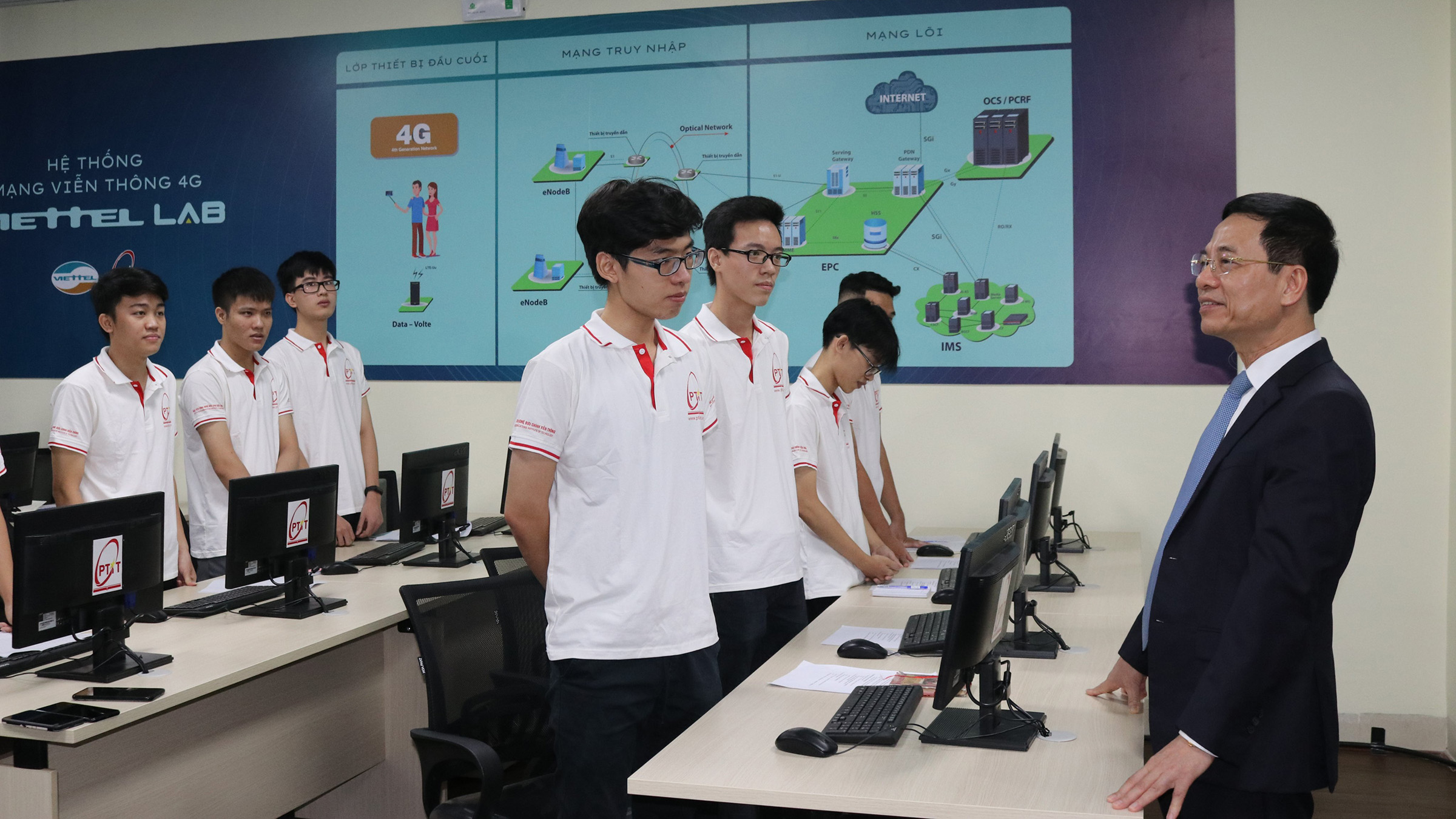 Ủy viên Trung ương Đảng, Bộ trưởng Bộ Thông tin và Truyền thông Nguyễn Mạnh Hùng nói chuyện với sinh viên Học viện Công nghệ Bưu chính viễn thông _Nguồn: ictvietnam.vn