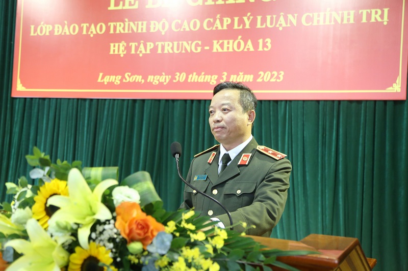 Phát biểu tại buổi lễ, đồng chí Đại tá Triệu Tuấn Hải, Phó bí thư Đảng ủy, Phó Giám đốc Công an tỉnh Lạng Sơn trân trọng cảm ơn Đảng ủy, Ban Giám đốc Học viện Chính trị CAND đã chủ trì tổ chức lớp đào tạo trình độ cao cấp lý luận chính trị, hệ tập trung, khoa 13 góp phần chuẩn hóa tiêu chuẩn LLCT cho cán bộ của Công an tỉnh Lạng Sơn. Hi vọng trong thời gian tới, Học viện Chính trị CAND tiếp tục quan tâm, tạo điều kiện tổ chức các lớp đào tạo, bồi dưỡng cán bộ chiến sỹ cho Công an tỉnh Lạng Sơn nhằm đáp ứng yêu cầu chuẩn hóa tiêu chuẩn cán bộ theo quy định lực lượng CAND, đáp ứng nhiệm vụ bảo vệ an ninh trật tự trong tình hình mới, đặc biệt là công tác đào tạo lý luận chính trị.