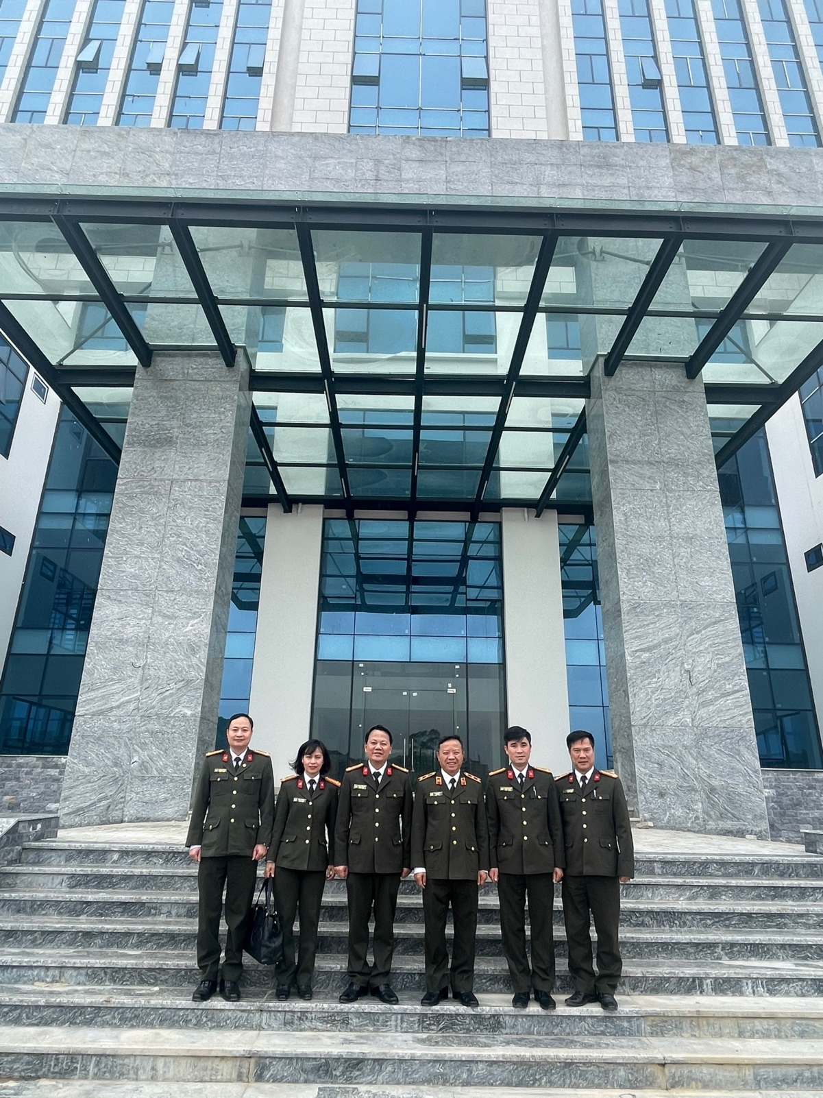 Đồng chí Trung tướng, PGS.TS Phan Xuân Tuy và đồng chí Đại tá Triệu Tuấn Hải cùng đoàn công tác học viện chụp ảnh tại trụ sở mới, chuẩn bị đưa vào sử dụng của Công an tỉnh Lạng Sơn.