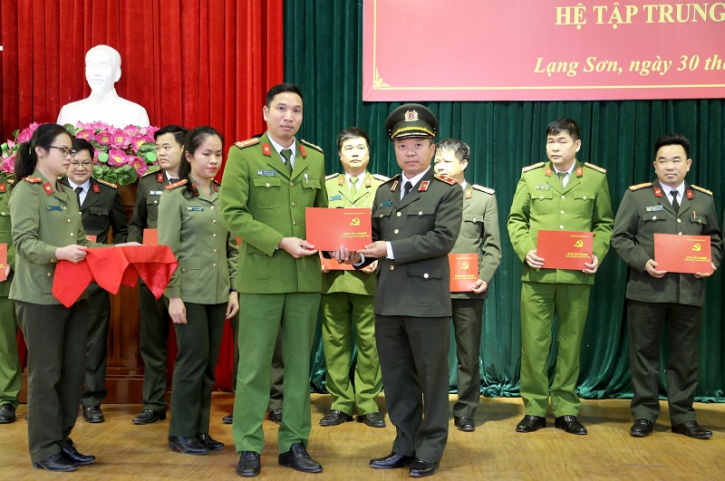 Đồng chí Đại tá Triệu Tuấn Hải, Phó Giám đốc Công an tỉnh Lạng Sơn trao giấy khen cho tập thể, cá nhân của Học viện Chính trị CAND có thành tích xuất sắc trong công tác tổ chức lớp học