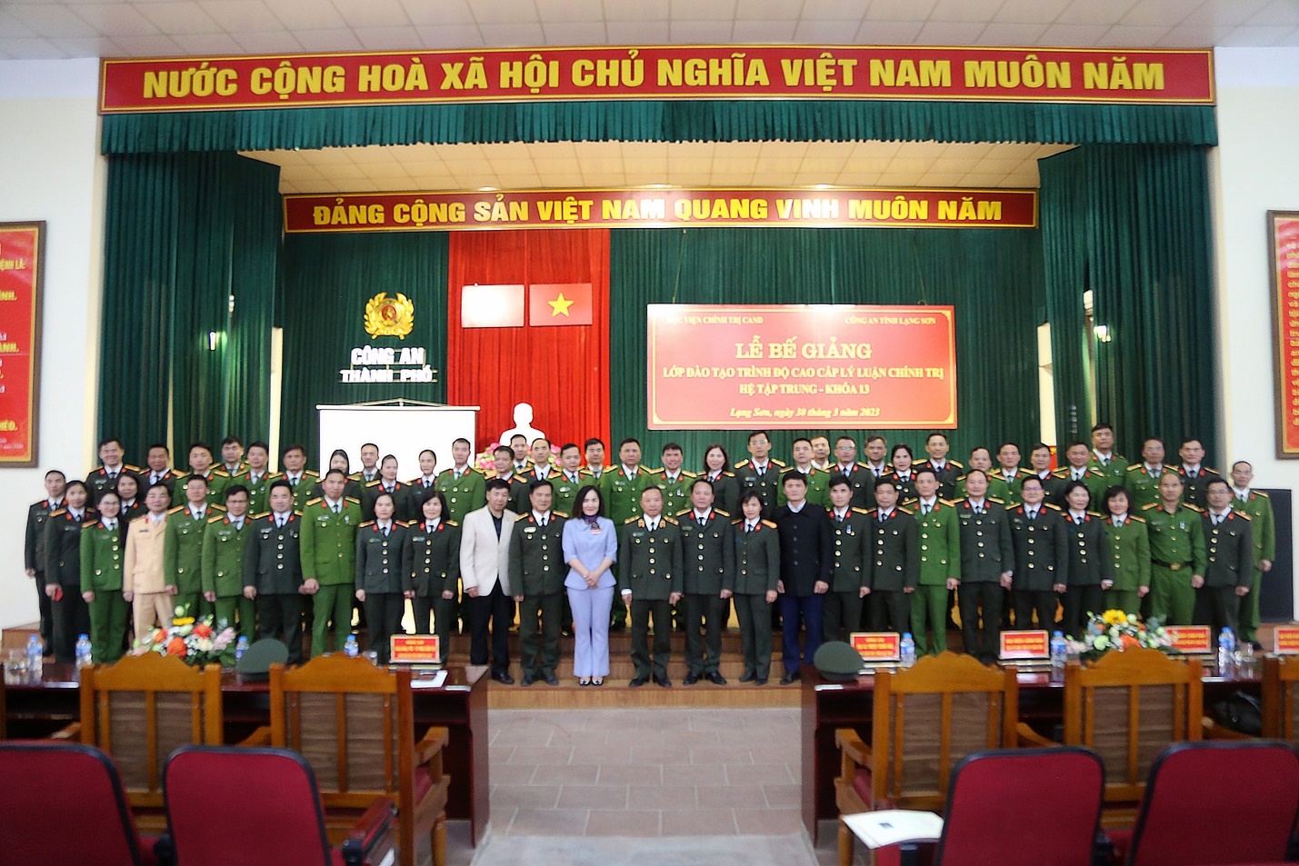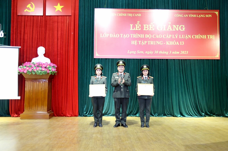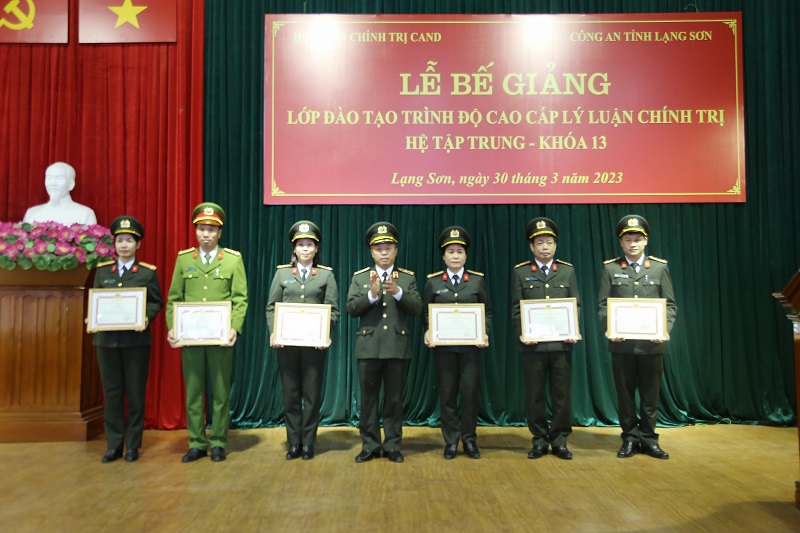 Thực hiện Kế hoạch số 510/KH-T03-P3, ngày 14/3/2023 của Học viện Chính trị CAND về việc tổ chức Lễ Bế giảng lớp đào tạo trình độ cao cấp LLCT, hệ tập trung Khóa 13 tổ chức tại Công an tỉnh Lạng Sơn, chiều ngày 30/3/2023, Học viện phối hợp với Công an tỉnh Lạng Sơn tổ chức Lễ bế giảng khóa học. Đồng chí Trung tướng, PGS.TS Phan Xuân Tuy, Bí Thư Đảng ủy, Giám đốc Học viện Chính trị CAND dự và chủ trì buổi Lễ. Tham dự Lễ bế giảng có đồng chí Đại tá Triệu Tuấn Hải, Phó Bí thư Đảng ủy, Phó Giám đốc Công an tỉnh Lạng Sơn; đại diện lãnh đạo Văn phòng Học viện, Phòng Chính trị, Phòng Quản lý đào tạo và bồi dưỡng nâng cao, Phòng Quản lý học viên của Học viện Chính trị CAND; đại diện lãnh đạo các đơn vị chức năng của Công an tỉnh Lạng Sơn; Lãnh đạo Ban tổ chức Tỉnh Ủy; Ban Tuyên giáo tỉnh ủy; lãnh đạo Trường chính trị Hoàng Văn Thụ; cùng toàn thể 50 học viên lớp học.