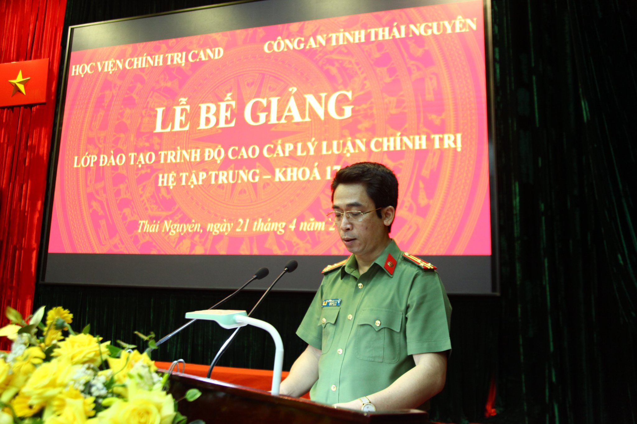 Phát biểu chỉ đạo tại buổi Lễ, đồng chí Giám đốc Học viện khẳng định khóa học đã hoàn thành tốt mục tiêu, yêu cầu của chương trình đào tạo đề ra; đồng chí biểu dương, đánh giá cao kết quả học tập, rèn luyện của học viên khóa học, trong đó tỉ lệ học viên đạt loại Giỏi chiếm tỉ lệ cao, có các học viên đạt thành tích học tập xuất sắc được Giám đốc Học viện Chính trị CAND tặng giấy khen. Đồng thời, kết quả đào tạo của khóa học đã tăng cường cho Công an tỉnh Thái Nguyên nhiều cán bộ nguồn có trình độ cao cấp LLCT đáp ứng yêu cầu công tác cán bộ trong thời gian tới, góp phần chuẩn hóa các điều kiện, tiêu chuẩn lý luận chính trị cho cán bộ Công an tỉnh Thái Nguyên đáp ứng yêu cầu, nhiệm vụ trong tình hình mới. Đồng chí Giám đốc Học viện quán triệt và đề nghị các học viên sau khi hoàn thành khóa học, trở về đơn vị công tác luôn luôn là những hạt nhân kiểu mẫu về giáo dục chính trị tư tưởng, tích cực truyền bá những giá trị đạo đức cách mạng, đem những giá trị tri thức tiếp thu được trong quá trình học tập áp dụng ngay vào thực tiễn công tác; tham mưu với cấp ủy, chính quyền địa phương triển khai có hiệu quả song song 02 nghị quyết của Bộ Chính trị: Nghị quyết số 12-NQ/TW, ngày 26/3/2022 của Bộ Chính trị về đẩy mạnh xây dựng lực lượng CAND thật sự trong sạch, vững mạnh, chính quy, tinh nhuệ, hiện đại, đáp ứng yêu cầu, nhiệm vụ trong tình hình mới; Nghị quyết số 11-NQ/TW, ngày 10/02/2022 của bộ Chính trị về phương hướng phát triển kinh tế - xã hội, dảm bảo quốc phòng, an ninh vùng trung du và miền núi Bắc Bộ đến năm 2030, tầm nhìn đến năm 2045. Phát huy vai trò là những hạt nhân trong các mặt công tác, nhất là công tác tuyên truyền, bảo vệ chủ nghĩa Mác - Lênin, tư tưởng Hồ Chí Minh, đường lối đổi mới của Đảng, Nhà nước, tạo sức lan tỏa mạnh mẽ trong các chi bộ, đảng bộ, cơ quan, đơn vị công tác, trong gia đình, trong quần chúng nhân dân về truyền thống anh hùng và hình ảnh tốt đẹp của người chiến sĩ CAND “bản lĩnh, nhân văn, vì nhân dân phục vụ”; thực hiện thắng lợi Nghị quyết số 16-NQ/ĐUCA, ngày 18/01/2023 của Đảng ủy Công an Trung ương về tăng cường công tác chính trị, tư tưởng đáp ứng yêu cầu xây dựng lực lượng CAND thật sự trong sạch, vững mạnh, chính quy, tinh nhuệ, hiện đại.