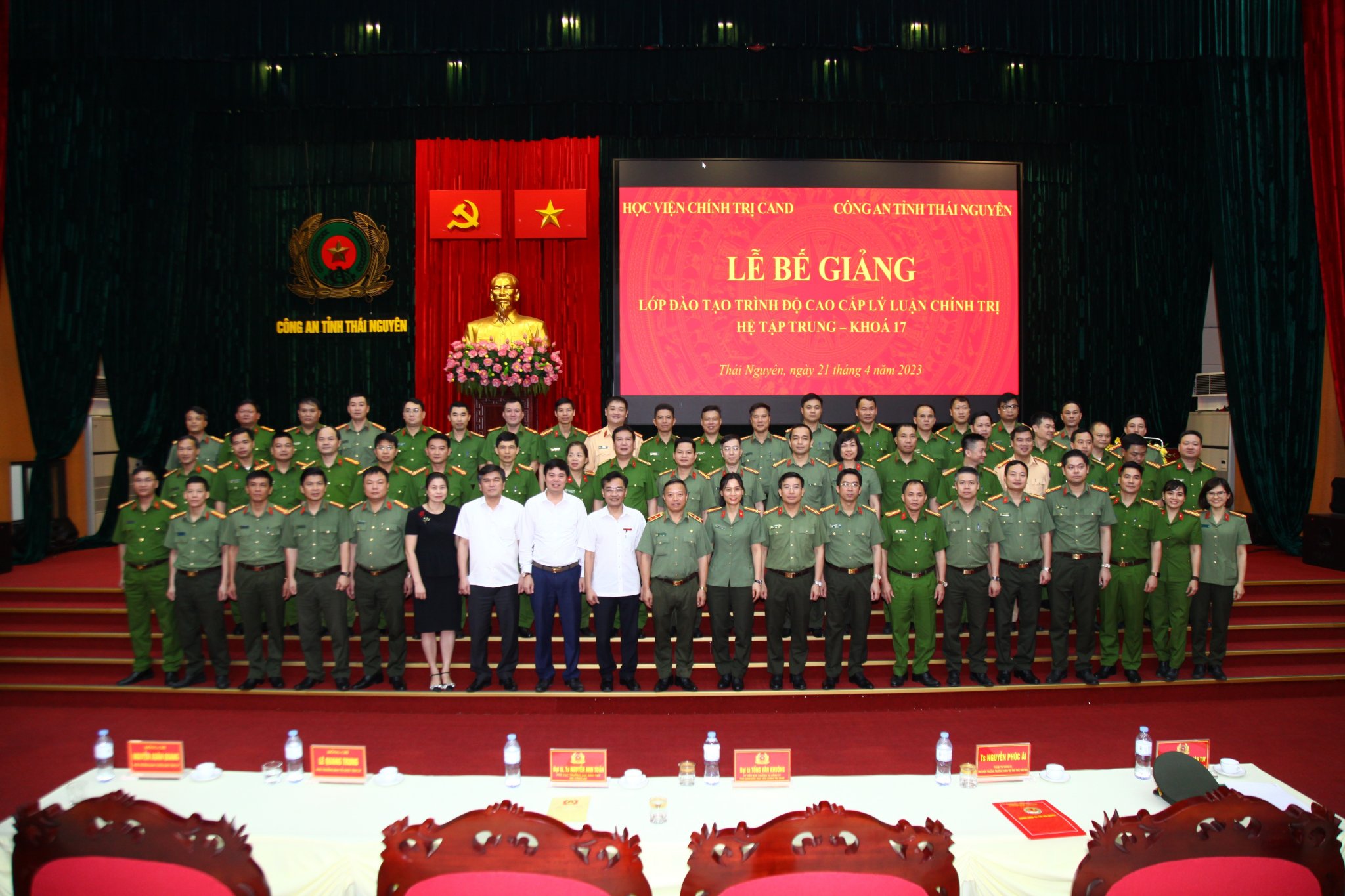 Thực hiện Kế hoạch số 859/KH-T03-P3, ngày 18/4/2023 của Học viện Chính trị CAND về việc tổ chức Lễ Bế giảng lớp đào tạo trình độ cao cấp LLCT, hệ tập trung Khóa 17 tổ chức tại Công an tỉnh Thái Nguyên dành cho cán bộ đang công tác tại Công an tỉnh Thái Nguyên và Trại giam Phú Sơn 4, C10, sáng ngày 21/4/2023, Học viện phối hợp với Công an tỉnh Thái Nguyên tổ chức Lễ bế giảng khóa học. Đồng chí Trung tướng, PGS.TS Phan Xuân Tuy, Bí Thư Đảng ủy, Giám đốc Học viện Chính trị CAND dự và chủ trì buổi Lễ. Tham dự Lễ bế giảng có đồng chí Thượng tá Nguyễn Hoàng Trí Kháng, Ủy viên Ban thường vụ Đảng ủy, Phó Giám đốc Công an tỉnh Thái Nguyên; đồng chí Đại tá, TS Nguyễn Anh Tuấn, Phó Bí thư Đảng ủy, Phó Cục trưởng Cục Đào tạo, Bộ Công an; đồng chí Lê Quang Trung, Phó Trưởng ban Ban Tổ chức Tỉnh ủy tỉnh Thái Nguyên; đồng chí TS Nguyễn Xuân Quang, Phó Trưởng ban Ban Tuyên giáo Tỉnh ủy tỉnh Thái Nguyên; đồng chí TS Nguyễn Phúc Ái, Phó Hiệu trưởng Trường Chính trị tỉnh Thái Nguyên; đại diện lãnh đạo các đơn vị chức năng của Học viện Chính trị CAND, Cục Đào tạo, Công an tỉnh Thái Nguyên và Trại giam Phú Sơn 4, C10 cùng toàn thể học viên lớp học.