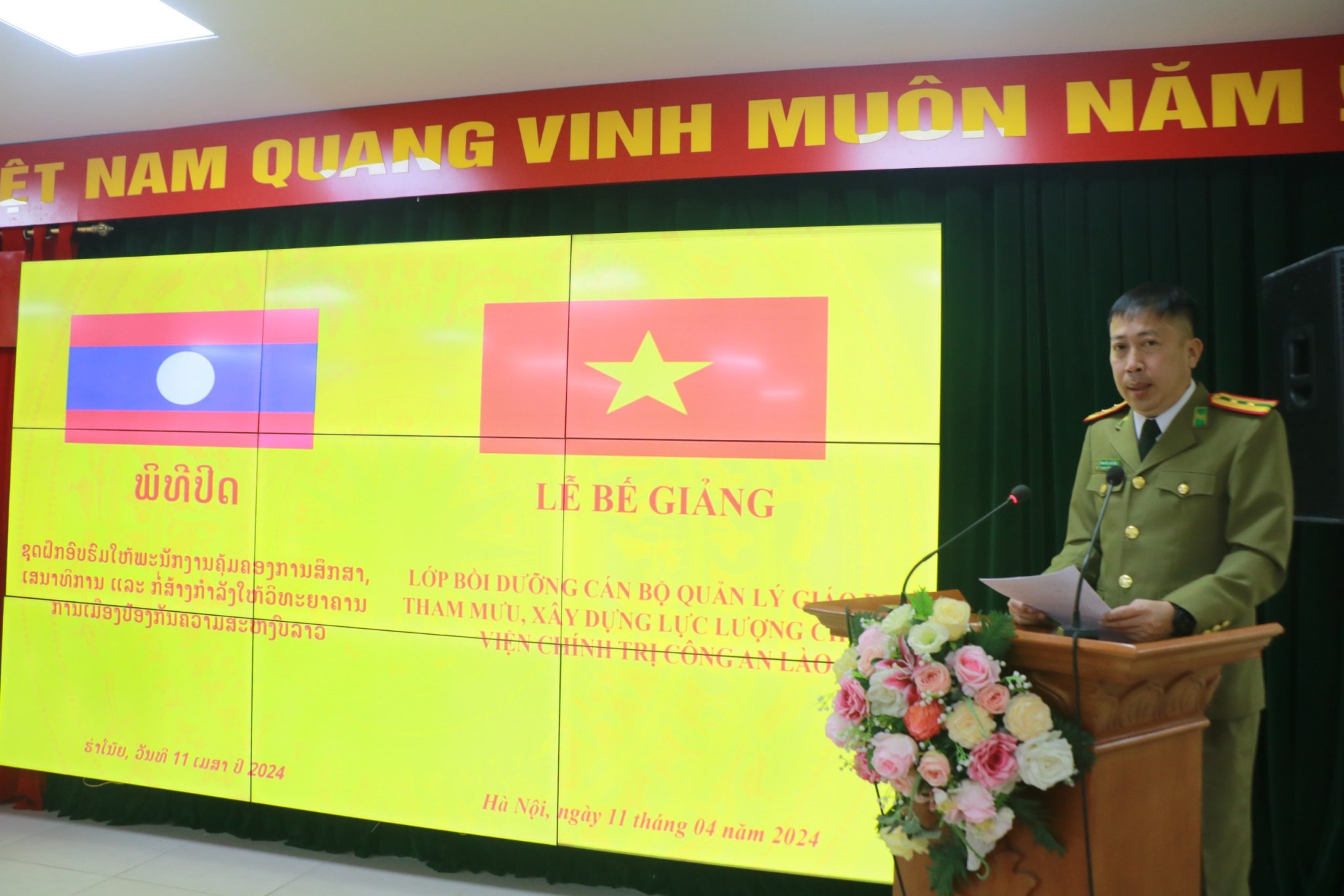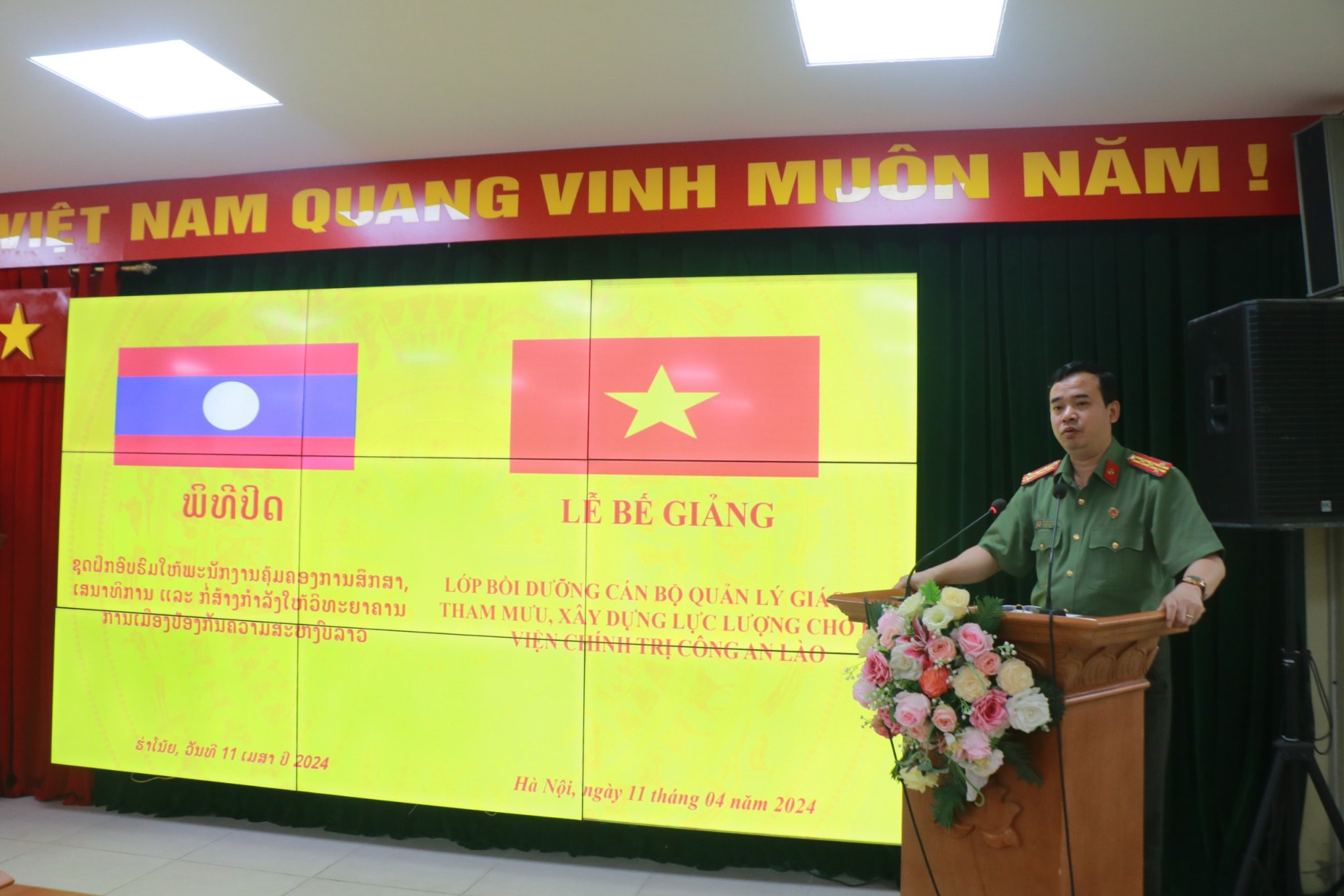 Thực hiện chỉ tiêu đào tạo, bồi dưỡng năm học 2023-2024, sáng ngày 11/4/2024, Học viện Chính trị CAND tổ chức lễ bế giảng lớp bồi dưỡng cán bộ quản lý giáo dục, tham mưu, xây dựng lực lượng cho Học viện Chính trị Công an Lào. Đồng chí Đại tá, TS Tống Văn Khuông, Ủy viên Ban Thường vụ Đảng ủy, Phó Giám đốc Học viện Chính trị CAND chủ trì buổi lễ.