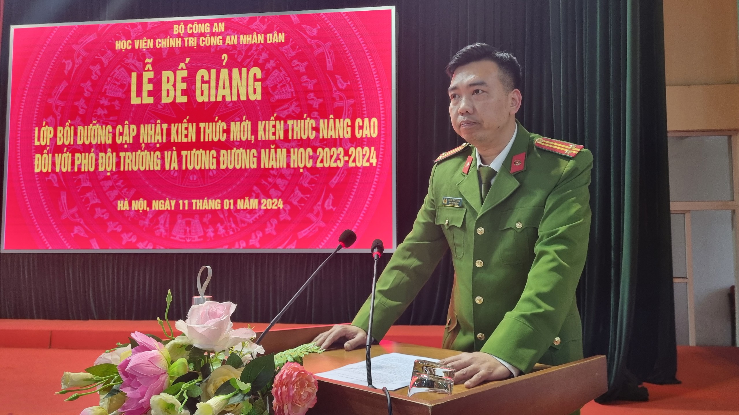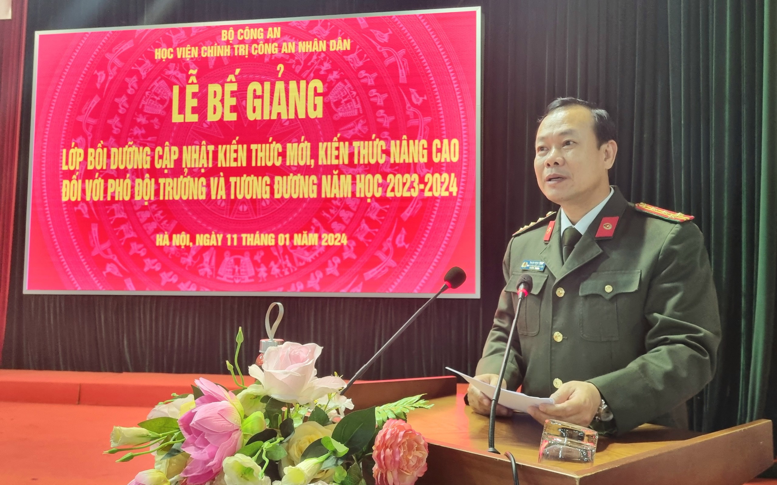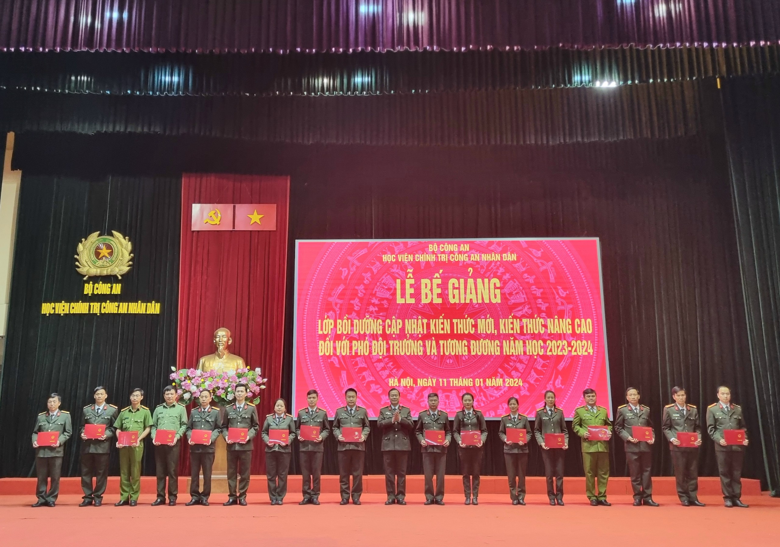 Chiều ngày 11/01/2024, Học viện Chính trị CAND đã trang trọng tổ chức Lễ bế giảng lớp bồi dưỡng cập nhật kiến thức mới, kiến thức nâng cao đối với Phó Đội trưởng và tương đương, năm học 2023-2024. Đồng chí Đại tá, TS Trần Văn Tuấn, Ủy viên Ban Thường vụ Đảng ủy, Phó Giám đốc Học viện Chính trị CAND chủ trì buổi lễ. Tham dự buổi lễ có đại diện lãnh đạo các đơn vị thuộc Học viện và toàn thể học viên của lớp học.