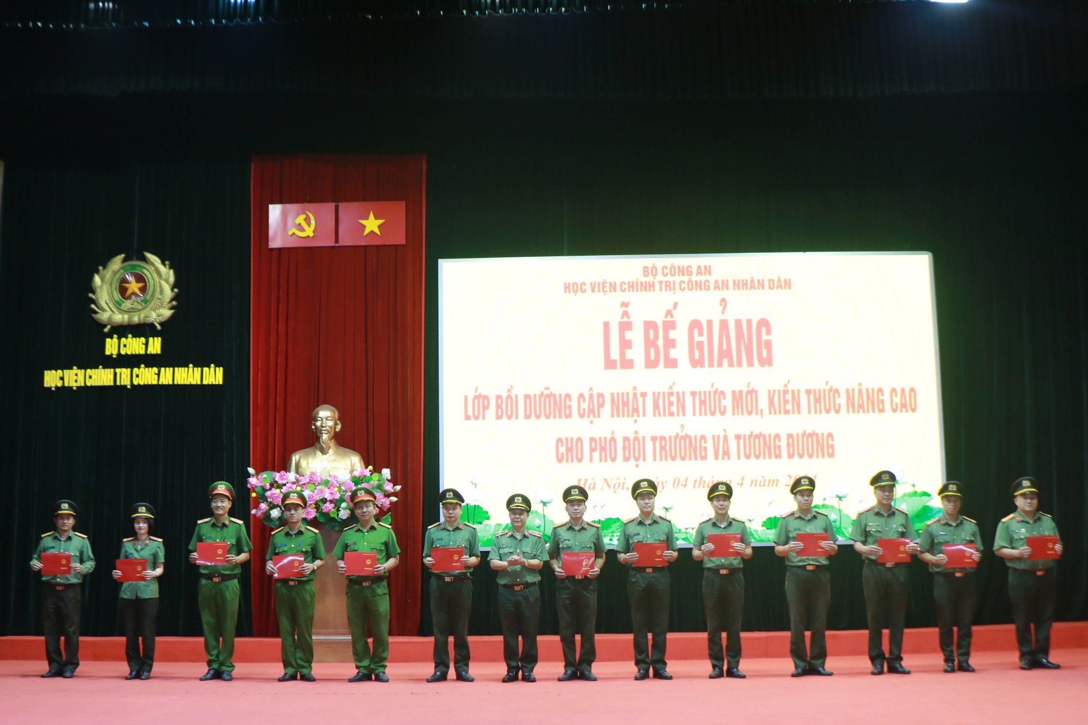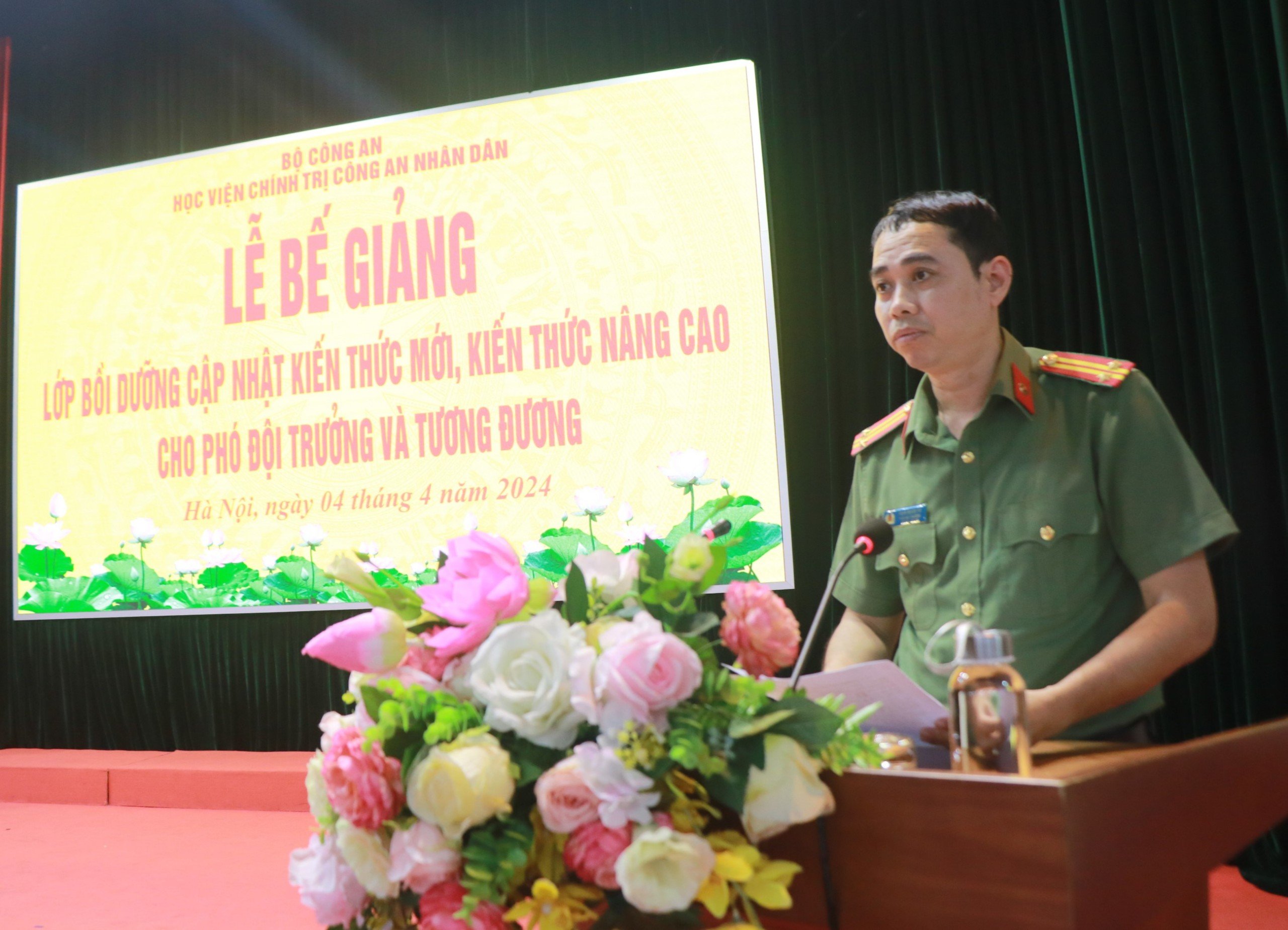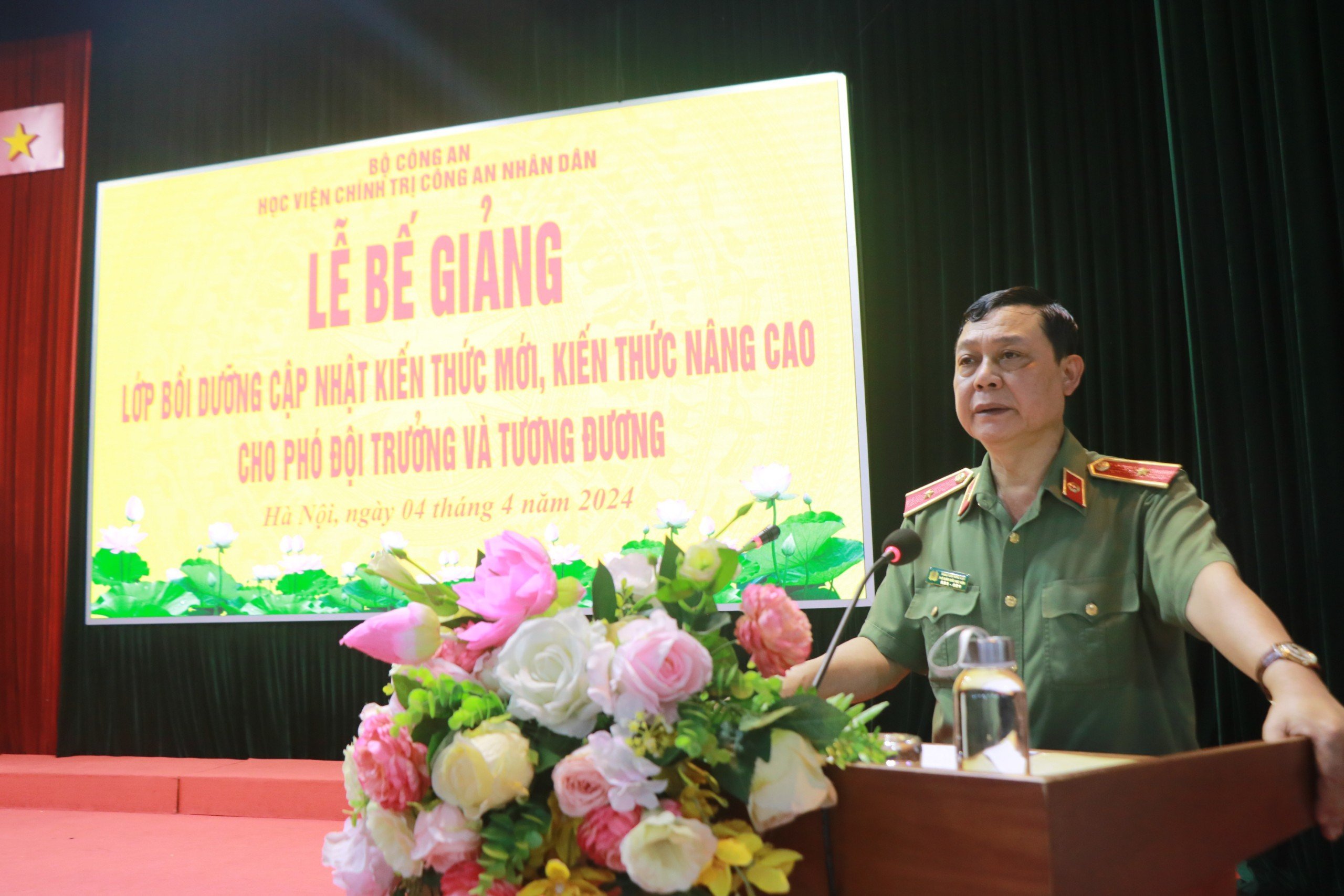 Sáng ngày 04/4/2024, Học viện Chính trị CAND đã trang trọng tổ chức Lễ bế giảng lớp bồi dưỡng cập nhật kiến thức mới, kiến thức nâng cao đối với Phó Đội trưởng và tương đương, năm học 2023-2024. Đồng chí Thiếu tướng, TS Nguyễn Như Lôi, Phó Bí thư Đảng ủy, Phó Giám đốc Học viện Chính trị CAND chủ trì buổi lễ. Tham dự buổi lễ có đại diện lãnh đạo các đơn vị thuộc Học viện và toàn thể học viên của lớp học.