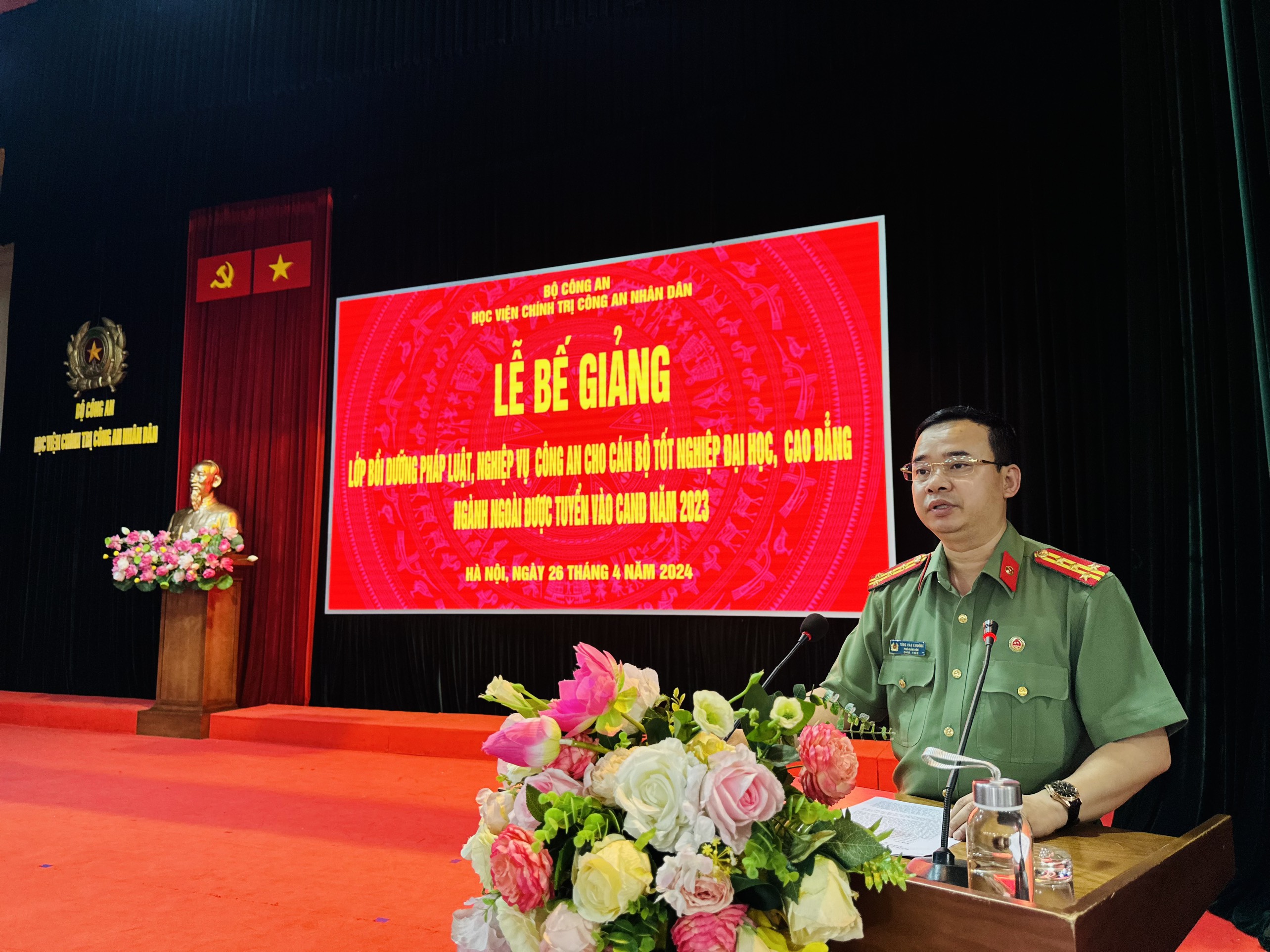 Phát biểu tại buổi Lễ, Đại tá, TS Tống Văn Khuông, Phó Giám đốc Học viện đã thay mặt Đảng uỷ, Ban Giám đốc Học viện chúc mừng các đồng chí học viên đã hoàn thành xuất sắc chương trình của khóa học. Đồng chí mong muốn những kiến thức các đồng chí tiếp nhận tại nhà trường sẽ là nền tảng lý kiến thức về pháp luật, nghiệp vụ Công an, áp dụng vào thực tiễn tại đơn vị mình, đồng thời đề nghị các đồng chí không ngừng củng cố và nâng cao bản lĩnh chính trị, nhận thức sâu sắc đường lối, quan điểm chỉ đạo của Đảng. Tiến tới thực hiện thành công Hội nghị Trung ương 8 khoá XIII của Đảng, đảm bảo hiệu quả việc thực hiện Nghị quyết số 12-NQ/TW, ngày 26/3/2022 của Bộ Chính trị góp phần xây dựng lực lượng CAND thật sự trong sạch, vững mạnh, chính quy, tinh nhuệ, hiện đại, đáp ứng yêu cầu, nhiệm vụ trong tình hình mới, mỗi cán bộ, đảng viên là những tấm gương điển hình trên cương vị của mình, tiếp tục phát huy những năng lực của bản thân, phụng sự nhân dân, phục sự Tổ quốc, xứng đáng lá cánh tay phải đắc lực của Đảng, vì Đảng, còn Đảng là còn mình.