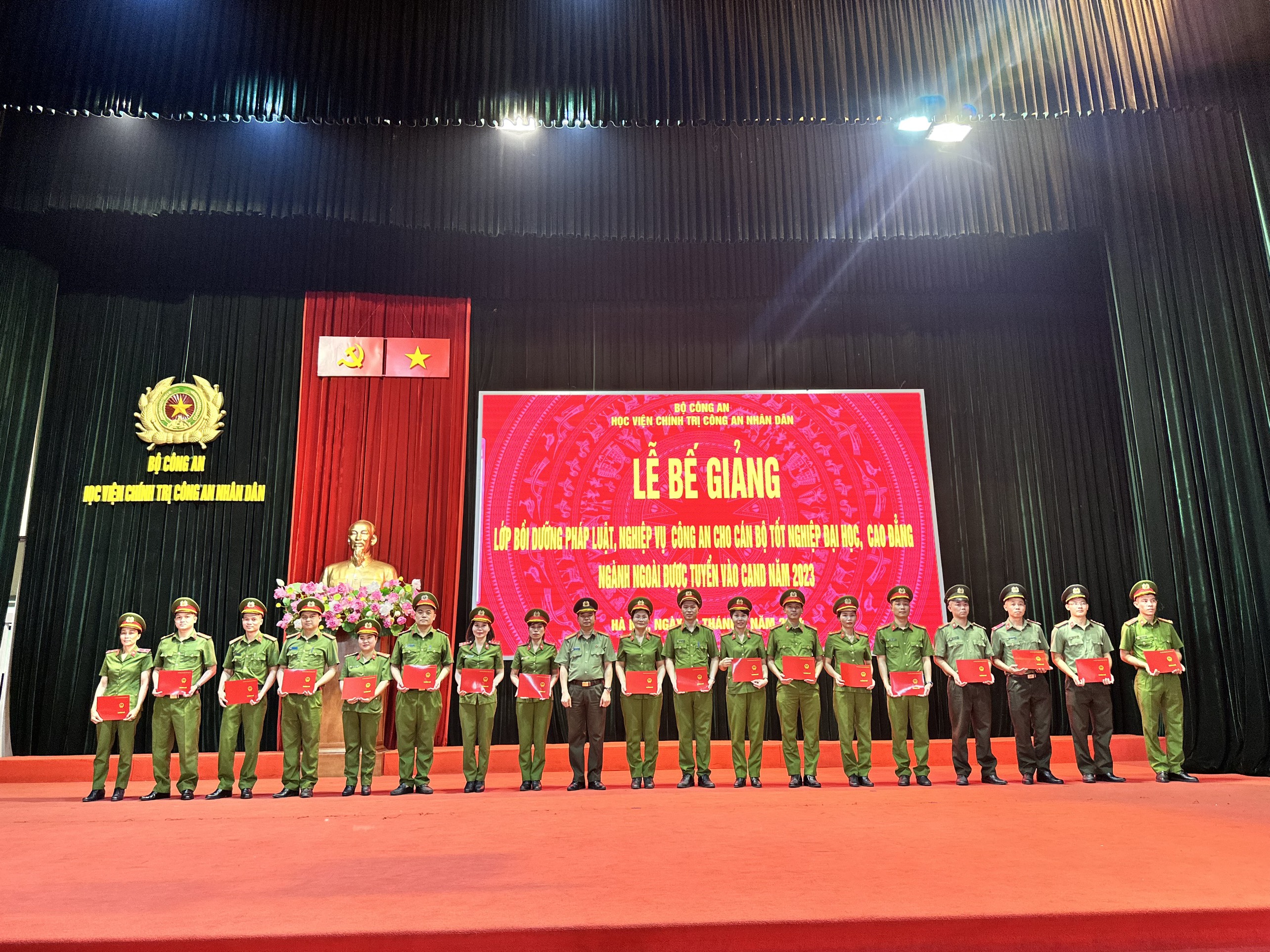 Thực hiện Kế hoạch số 754 /KH-T03-P6 ngày 23/4/2024 của Học viện Chính trị CAND về việc tổ chức Bế giảng Lớp bồi dưỡng pháp luật, nghiệp vị Công an cho cán bộ tốt nghiệp đại học, cao đẳng ngành ngoài được tuyển vào Công an nhân dân năm 2023 mở tại Học viện, chiều ngày 26/4/2024, Học viện trang trọng tổ chức lễ Bế giảng khoá học. Đồng chí Đại tá, TS Tống Văn Khuông, Uỷ viên Ban Thường vụ Đảng uỷ, Phó Giám đốc Học viện Chính trị Công an nhân chủ trì buổi lễ; tham dự có đại diện lãnh đạo các đơn vị chức năng thuộc Học viện Chính trị CAND cùng toàn thể học viên lớp học.