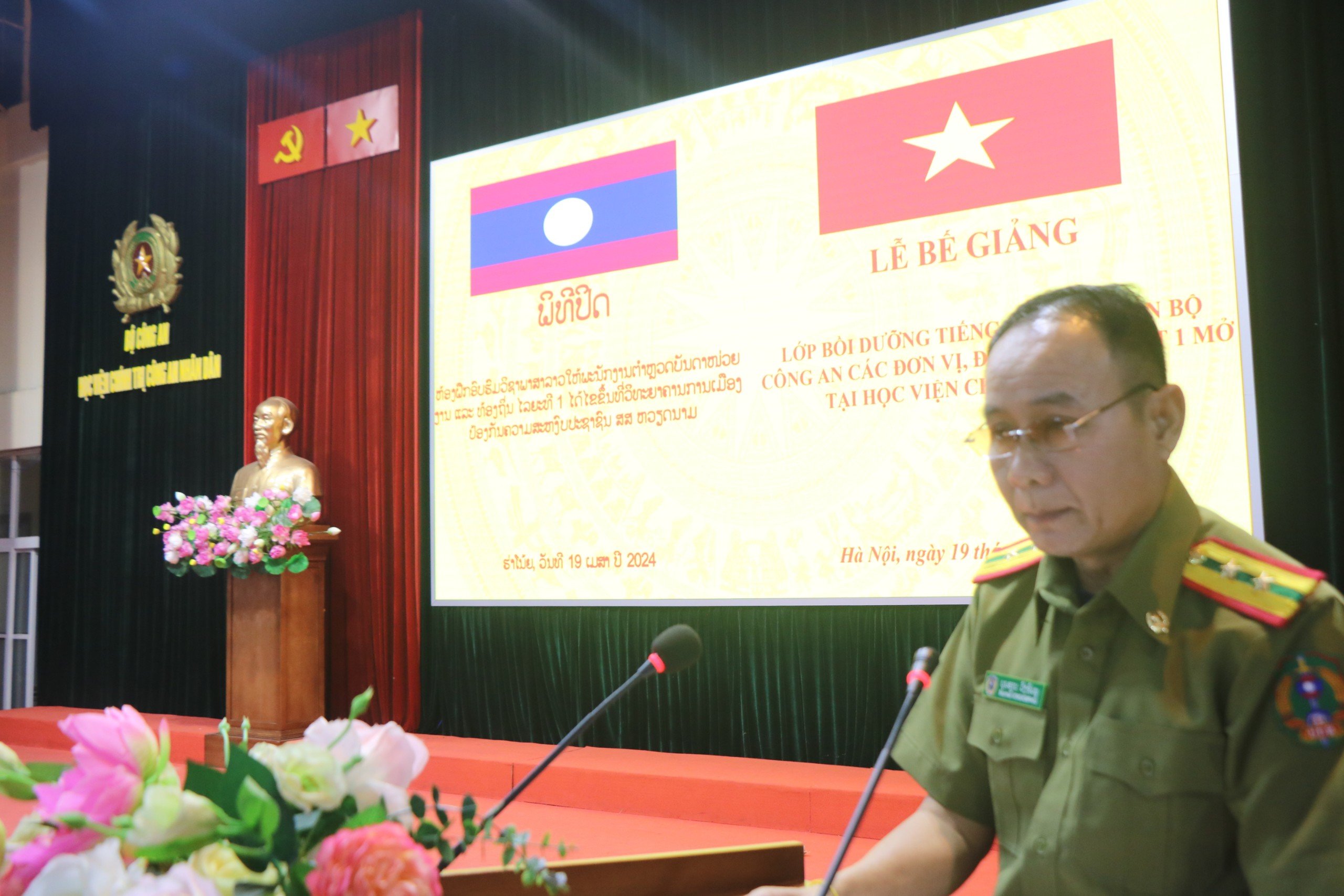 Phát biểu tại buổi lễ, thay mặt Đảng ủy, Ban Giám đốc Học viện, đồng chí Thiếu tướng, TS Nguyễn Như Lôi, Phó Bí thư Đảng ủy, Phó Giám đốc Học viện chúc mừng các học viên đã hoàn thành chương trình bồi dưỡng đạt kết quả cao. Đồng chí Phó Giám đốc cảm ơn các chuyên gia Bộ Công an Lào đã khắc phục khó khăn, hoàn thành nhiệm vụ giảng dạy cho cán bộ Công an Việt Nam; biểu dương các học viên của lớp học đã nêu cao tinh thần trách nhiệm, tích cực, chủ động học tập tiếp thu kiến thức mới. Đồng chí bày tỏ mong muốn, các học viên với những kiến thức đã được học sẽ áp dụng tốt vào thực tiễn công tác, nâng cao chất lượng, hiệu quả thực hiện nhiệm vụ được giao. Đồng thời, mỗi học viên cũng sẽ mang theo những kỷ niệm đẹp về mái trường Học viện Chính trị CAND.