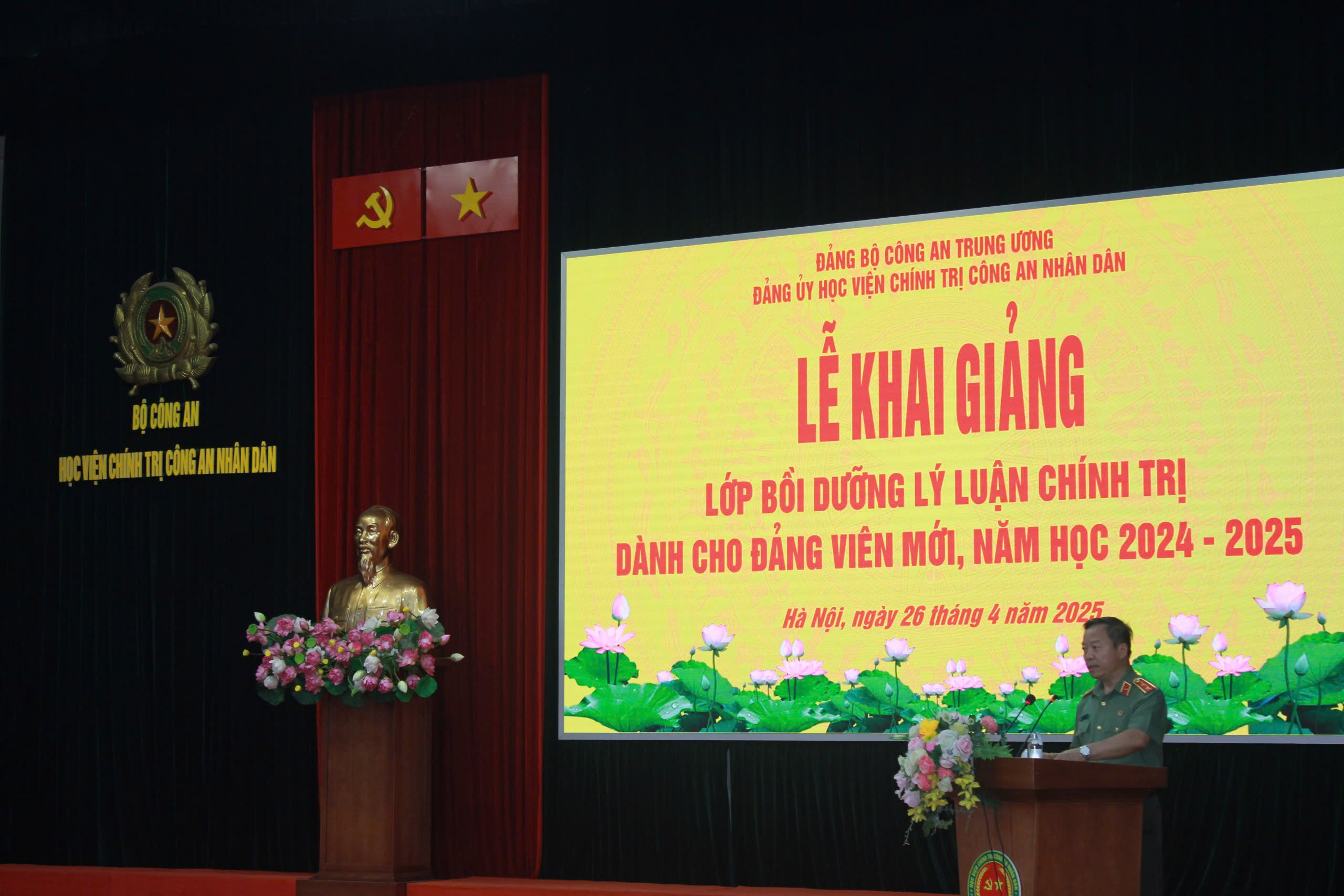 Đồng chí cũng nhấn mạnh: lớp đảng viên mới là chương trình bắt buộc, có ý nghĩa đối với các đảng viên trẻ, giúp cho đảng viên trẻ nắm được nội dung cách mạng của Đảng ta, đường lối phát triển kinh tế, văn hóa, xã hội để sẵn sang bước vào kỷ nguyên mới, kỷ nguyên vươn mình của dân tộc Việt Nam, đích đến của kỷ nguyên vươn minh là giàu mạnh, phồn vinh, thịnh vượng, sánh vai với các cường quốc năm châu. Lớp học được diễn ra trong bối cảnh đại hội đảng bộ các cấp nhiệm kỳ 2025 -2030 tiến tới Đại hội đại biểu toàn quốc lần thứ XIV của Đảng. Do vậy phải thường xuyên, cập nhật theo dõi các tài liệu, văn kiện về đại hội đảng các cấp, có kiến thức sâu rộng về lý luận chính trị để học viên có nhận thức về xã hội càng rõ hơn, có tư duy chính trị ở tầm cao hơn để hoàn thành xuất sắc nhiệm vụ được giao với tâm thế, quyết tâm cao độ. Do đó, trong những năm qua Đảng ủy Học viện Chính trị CAND đã xây dựng nhiều Nghị quyết, chương trình kế hoạch cụ thể, tập trung chỉ đạo các tổ chức Đảng trực thuộc, các tổ chức quần chúng đề ra kế hoạch, mục tiêu phấn đấu, không ngừng nâng cao số lượng, chất lượng đảng viên ưu tú đứng trong hàng ngũ của Đảng cộng sản Việt Nam.