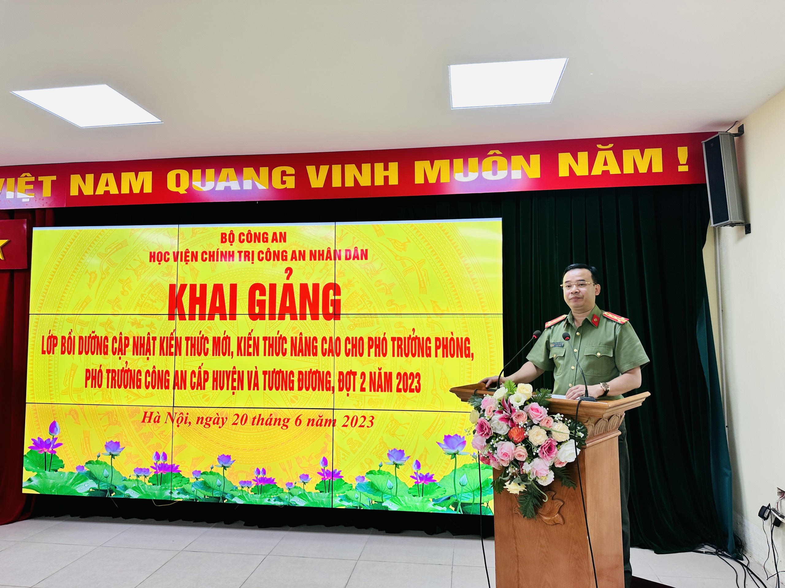 Ngày 20/6/2023, Học viện Chính trị Công an nhân dân tổ chức Lễ Khai giảng Lớp Bồi dưỡng cập nhật kiến thức mới, kiến thức nâng cao cho Phó trưởng phòng và Phó trưởng công an cấp huyện và tương đương, đợt 2, năm 2023. Đồng chí Đại tá, TS Tống Văn Khuông, Ủy viên Ban thường vụ Đảng ủy, Phó Giám đốc Học viện chủ trì buổi lễ. Tham dự có: lãnh đạo các đơn vị chức năng thuộc Học viện Chính trị CAND cùng toàn thể học viên khóa học.