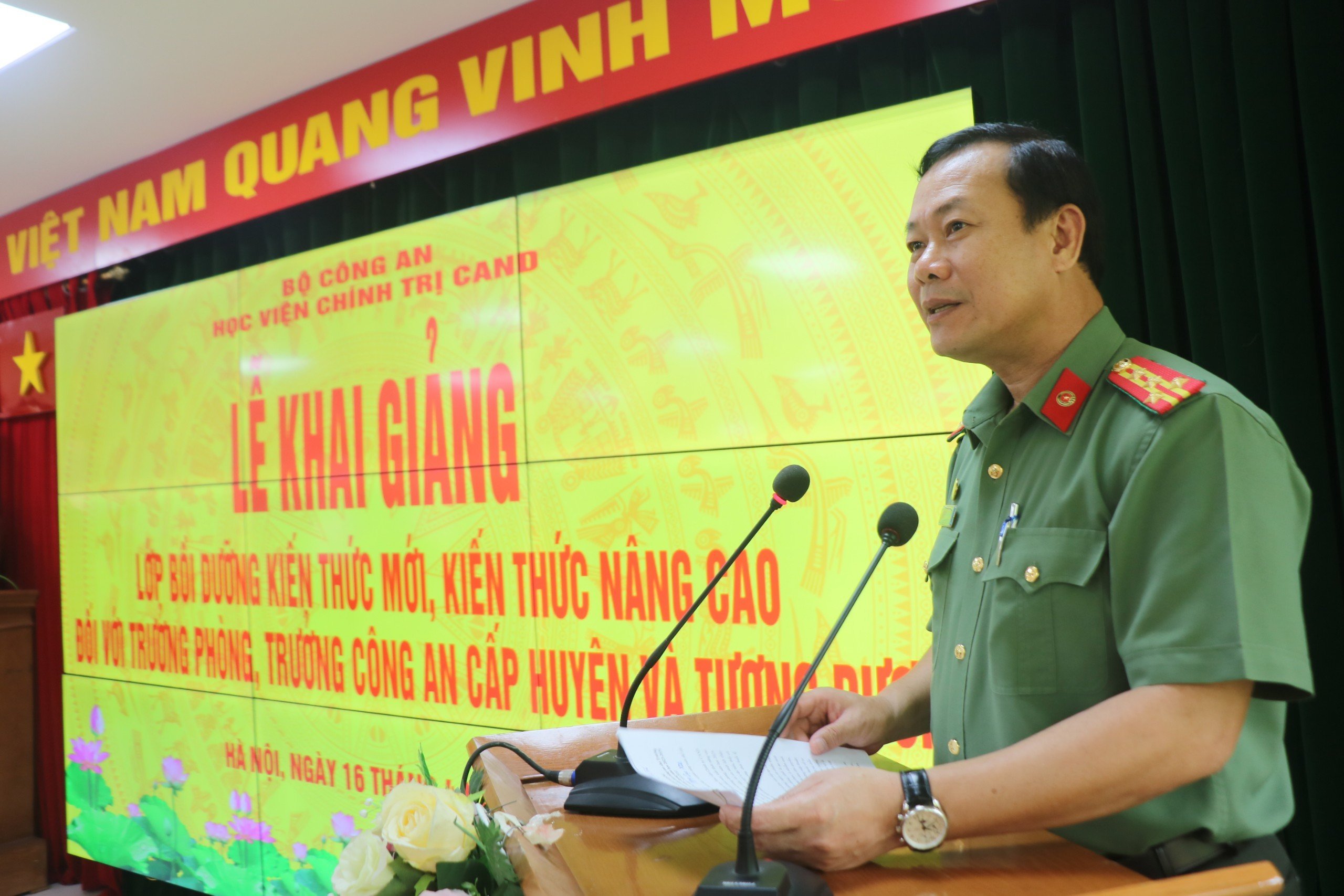 Thực hiện chỉ tiêu đào tạo, bồi dưỡng cán bộ CAND của Bộ Công an, sáng ngày 16/4/2024, Học viện Chính trị CAND tổ chức Lễ khai giảng lớp bồi dưỡng cập nhật kiến thức mới, kiến thức nâng cao cho Trưởng phòng, Trưởng Công an cấp huyện và tương đương năm học 2023-2024. Đồng chí Đại tá, TS Trần Văn Tuấn, Ủy viên Ban Thường vụ Đảng ủy, Phó Giám đốc Học viện chủ trì buổi lễ. Tham dự buổi lễ có đại diện lãnh đạo các đơn vị chức năng thuộc Cục Đào tạo, các đơn vị thuộc Học viện và toàn thể học viên lớp học.