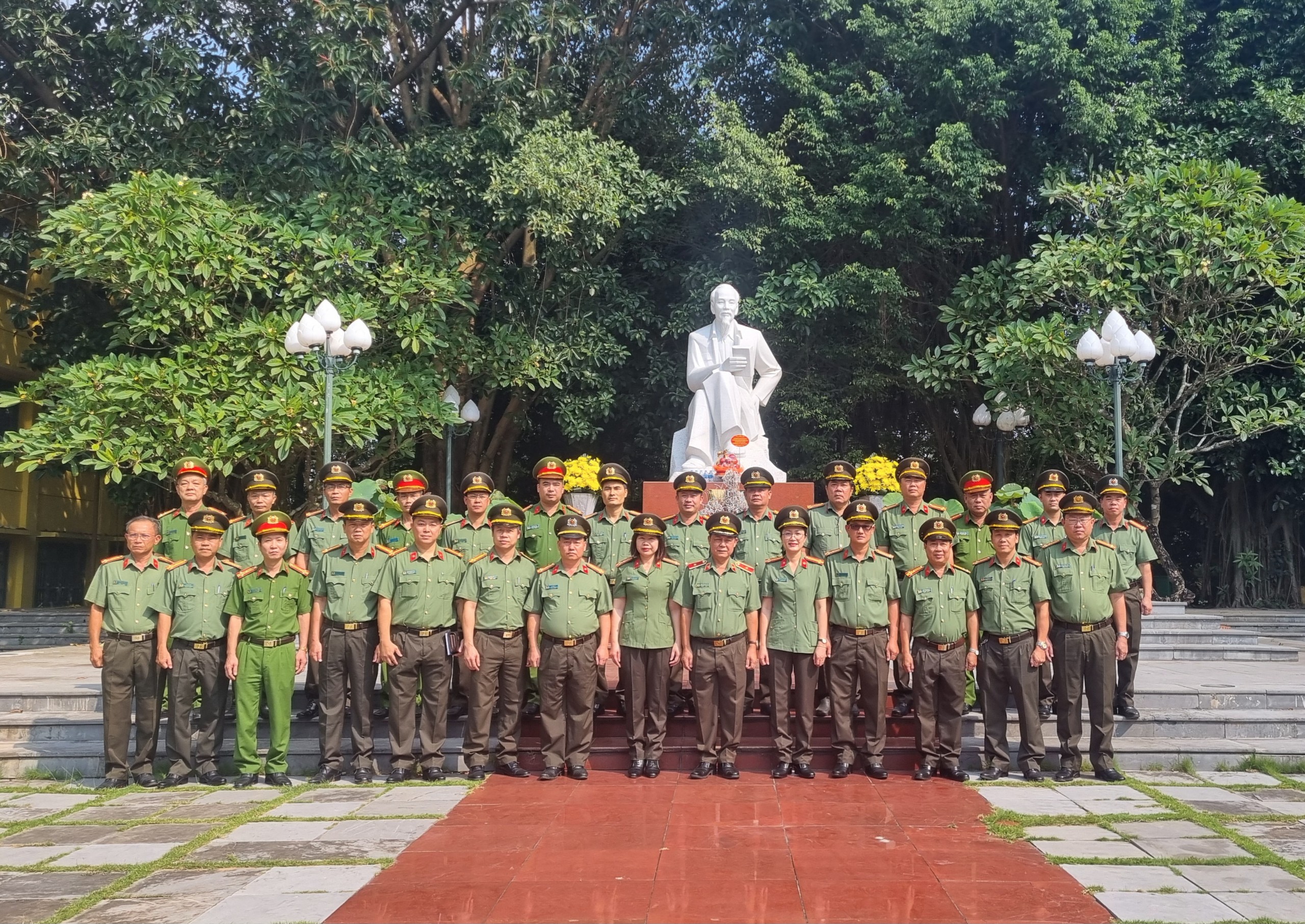 Đồng chí Thiếu tướng, TS Nguyễn Như Lôi, Phó Giám đốc Học viện và đại biểu, học viên lớp học chụp ảnh lưu niệm tại Công viên tượng đài Chủ tịch Hồ Chí Minh.