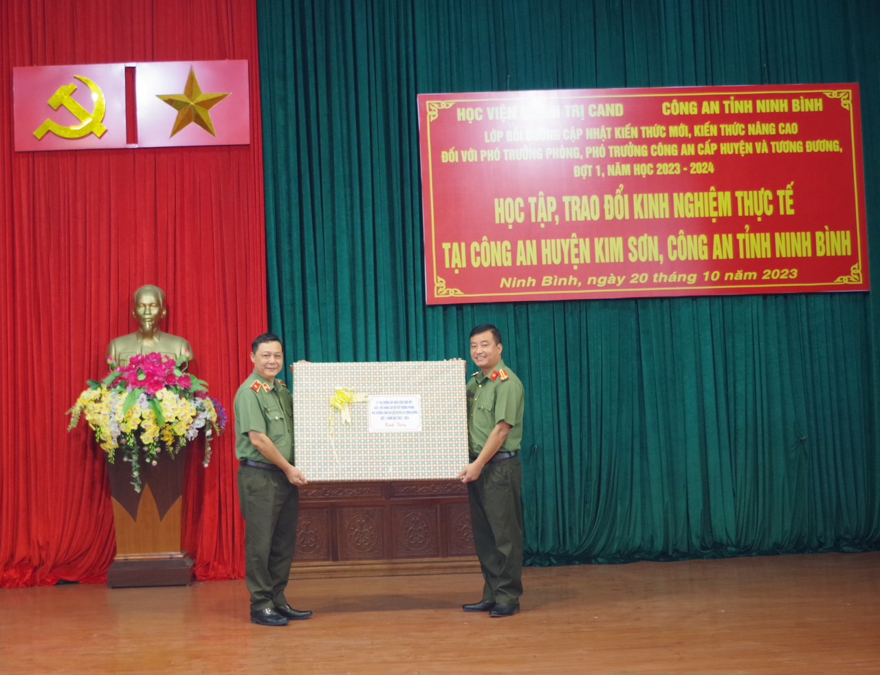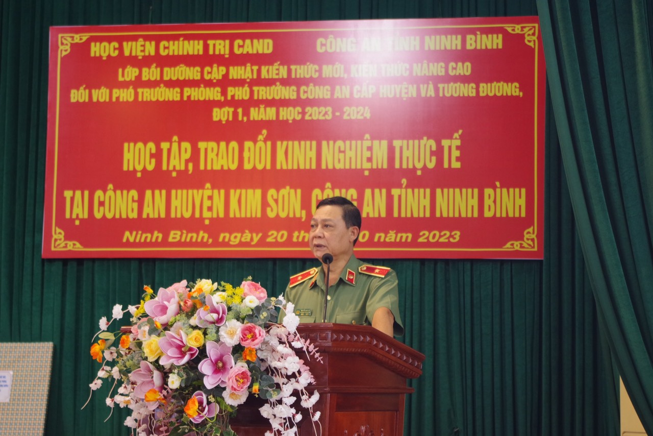 Thực hiện Kế hoạch số 2218/KH-T03, ngày 18/10/2023 về việc tổ chức đi học tập thực tế, thực hành chính trị lớp Bồi dưỡng cập nhật kiến thức mới, kiến thức nâng cao đối với Phó trưởng phòng, Phó trưởng Công an cấp huyện và tương đương, đợt 1, năm học 2023-2024. Ngày 20/10/2023, Học viện Chính trị Công an nhân dân tổ chức cho học viên Lớp Bồi dưỡng cập nhật kiến thức mới, kiến thức nâng cao đối với Phó Trưởng phòng, Phó Trưởng Công an cấp huyện và tương đương, đợt 1, năm học 2023 - 2024 đi học tập, trao đổi kinh nghiệm thực tế tại Công an huyện Kim Sơn, Công an tỉnh Ninh Bình. Được sự phân công của đồng chí Giám đốc Học viện, đồng chí Thiếu tướng, TS Nguyễn Như Lôi, Ủy viên Ban Thường vụ Đảng ủy, Phó Giám đốc Học viện Chính trị Công an nhân dân làm Trưởng đoàn Đoàn công tác. Tham gia Đoàn còn có đại diện lãnh đạo Phòng Quản lý đào tạo và bồi dưỡng nâng cao, cùng 32 học viên của lớp bồi dưỡng.