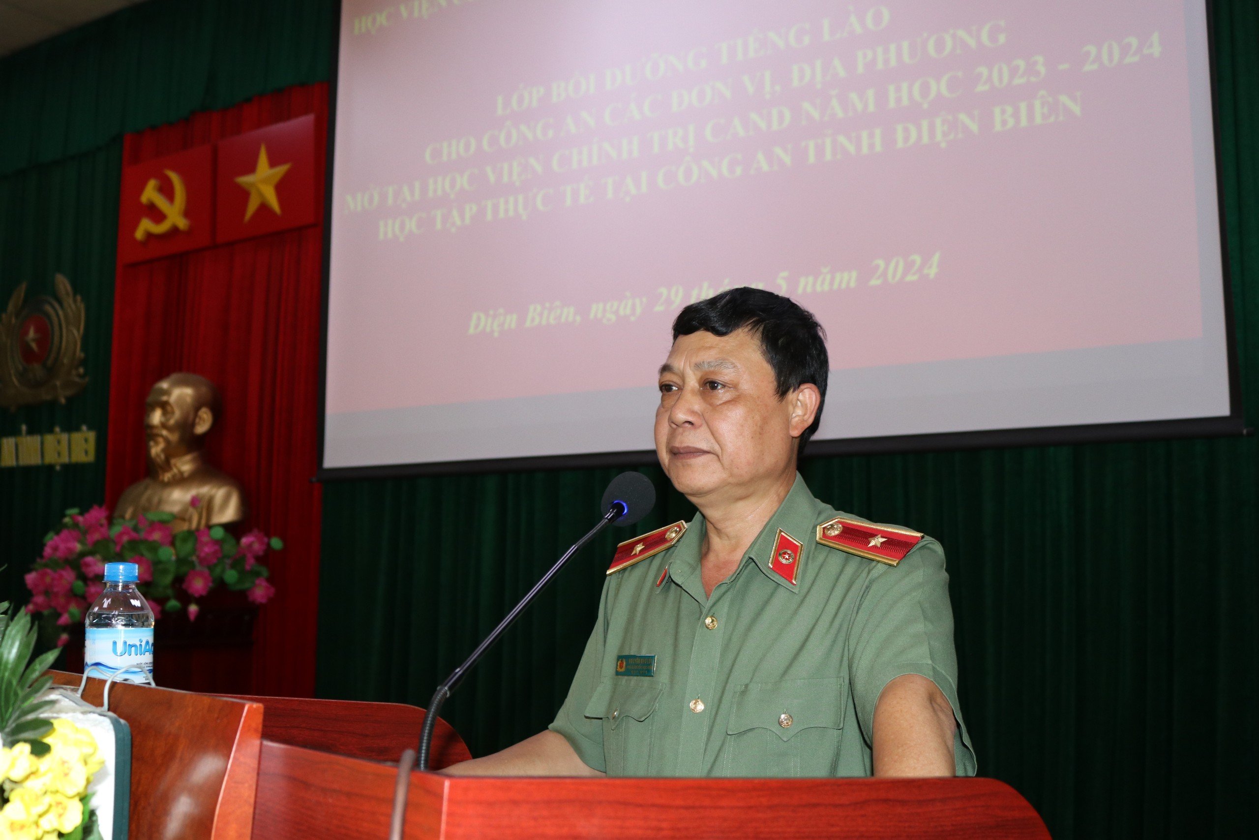 Phát biểu tại buổi làm việc, đồng chí Thiếu tướng, TS Nguyễn Như Lôi, Phó Bí thư Đảng ủy, Phó Giám đốc Học viện gửi lời chúc mừng tới cán bộ, chiến sĩ Công an tỉnh Điện Biên về những thành tích xuất sắc trong quá trình công tác, đặc biệt là trong công tác tham mưu, đảm bảo an ninh trật tự phục vụ tổ chức Lễ kỷ niệm 70 năm chiến thắng Điện Biên Phủ. Đồng chí Phó Giám đốc Học viện đã giới thiệu tổng quát về vị trí, vai trò, chức năng, nhiệm vụ, những thành tích đã đạt được của Học viện trong vòng 10 năm xây dựng và phát triển. Trong đó, năm học 2023-2024, Học viện Chính trị CAND được Bộ Công an giao tổ chức 04 lớp bồi dưỡng tiếng Lào cho cán bộ Công an các đơn vị, địa phương trên cả nước, do các đồng chí giảng viên của Bộ Công an Lào phụ trách giảng dạy. Trải qua một thời gian học tập, Học viện phối hợp với Công an tỉnh Điện Biên tổ chức học tập, trao đổi kinh nghiệm thực tế để tạo cơ hội cho học viên lớp học được lắng nghe, tiếp thu kinh nghiệm từ địa bàn có đường biên giới với nước bạn Lào, đã tổ chức nhiều lớp bồi dưỡng tiếng Lào cho cán bộ, chiến sĩ. Quán triệt mục đích, yêu cầu của buổi làm việc, đồng chí Phó Giám đốc Học viện yêu cầu toàn thể học viên lớp học nêu cao tinh thần, trách nhiệm, tích cực trao đổi để buổi làm việc diễn ra thành công tốt đẹp.