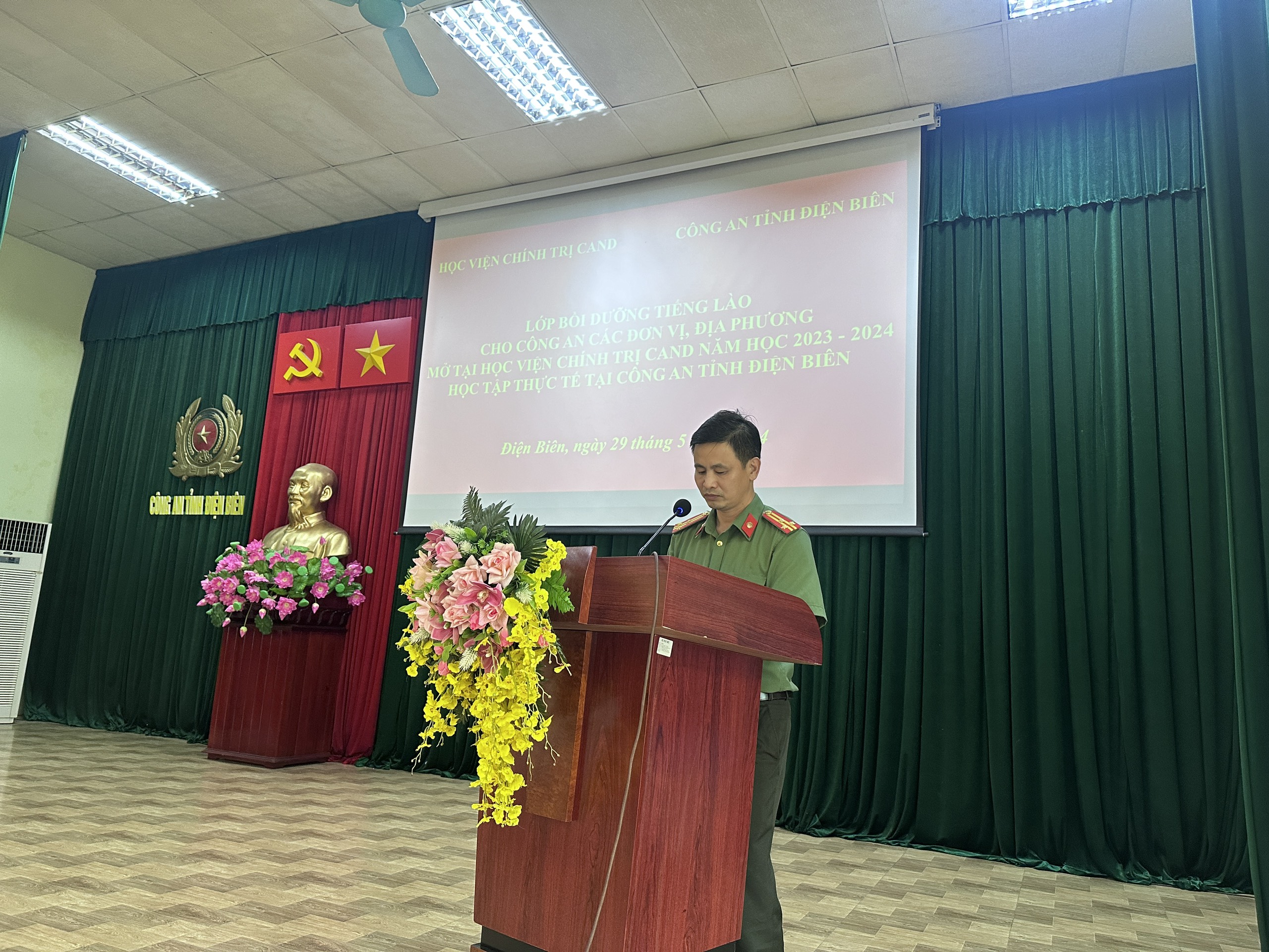 Tại buổi làm việc, các học viên lớp học đã được nghe đồng chí Thượng tá Trịnh Đức Thành, Phó Trưởng phòng PX01, Công an tỉnh Điện Biên báo cáo về tình hình, đặc điểm công tác của đơn vị, kết quả công tác bồi dưỡng tiếng Lào của Công an tỉnh. Đại diện giảng viên Bộ Công an Lào, học viên lớp bồi dưỡng tiếng Lào cho cán bộ Công an các đơn vị, địa phương mở tại Học viện Chính trị CAND, đại diện học viên tiếng Lào tại Công an tỉnh Điện Biên, giảng viên Trung tâm Ngoại ngữ - Tin học, Sở Giáo dục và Đào tạo Điện Biên, đại diện lưu học sinh Lào tại Trường Cao đẳng Y tế Điện Biên đã phát biểu, trao đổi những kinh nghiệm trong học tập, giảng dạy tiếng Lào.