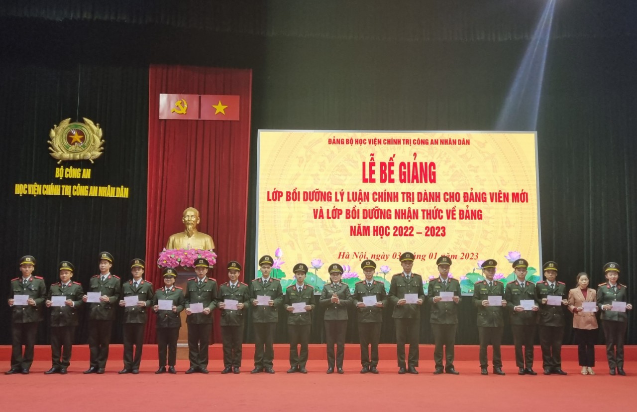 Thực hiện chương trình công tác của Đảng ủy Học viện Chính trị CAND, chiều ngày 03/01/2023, Đảng ủy Học viện đã trang trọng tổ chức Lễ Bế giảng lớp Bồi dưỡng lý luận chính trị dành cho đối tượng kết nạp Đảng và Bồi dưỡng lý luận chính trị dành cho đảng viên mới năm học 2022-2023. Dự và chủ trì buổi lễ có đồng chí Thiếu tướng, PGS. TS Đinh Ngọc Hoa, Phó Bí thư Đảng ủy, Phó Giám đốc Học viện. Tham dự buổi lễ có đại diện cấp ủy các tổ chức đảng trực thuộc Đảng ủy Học viện, đại diện lãnh đạo Phòng Chính trị và 53 học viên 02 lớp học.