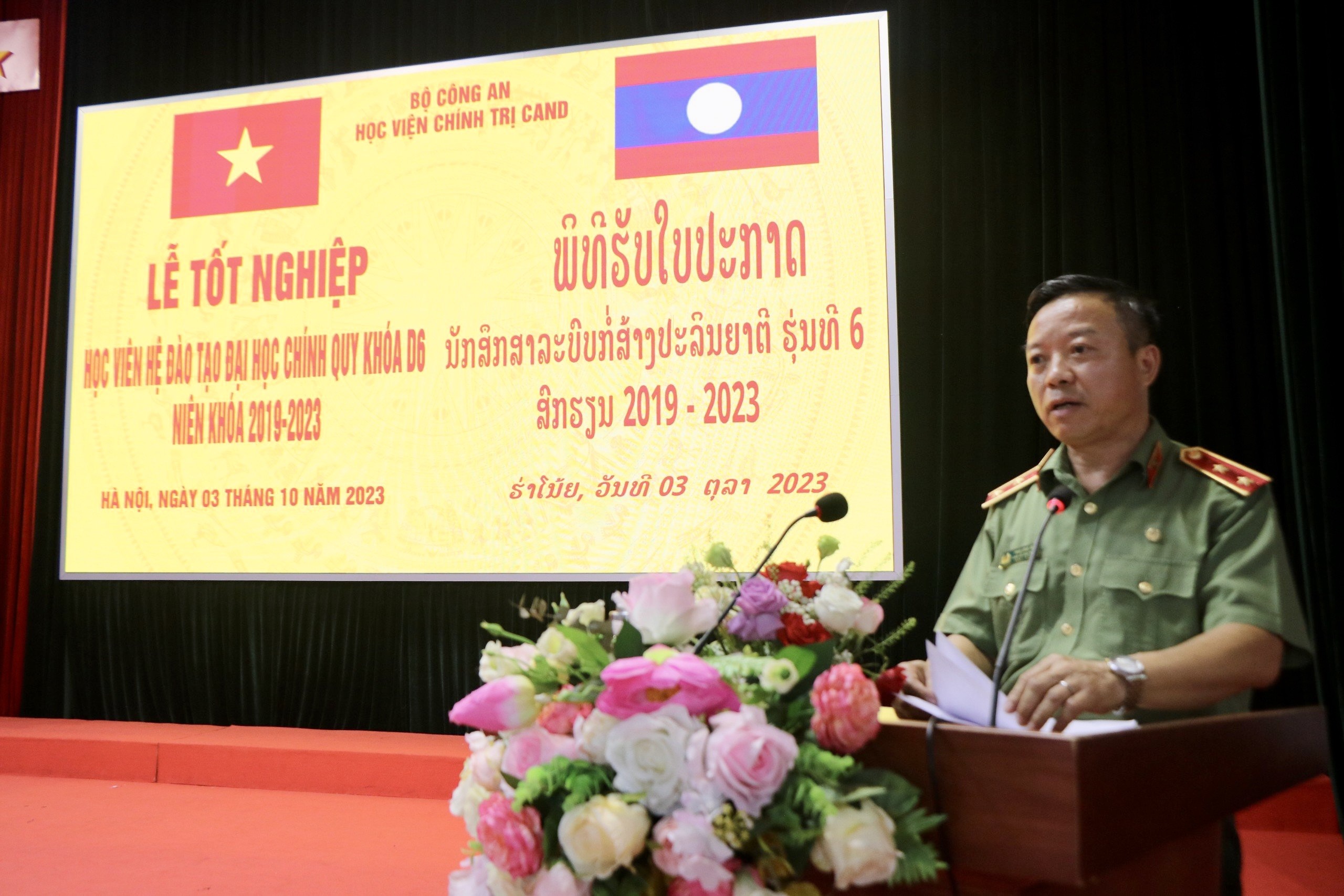 Phát biểu tại buổi lễ, đồng chí Trung tướng, PGS. TS Phan Xuân Tuy, Bí thư Đảng ủy, Giám đốc Học viện đã nhiệt liệt biểu dương, ghi nhận và chúc mừng những kết quả học tập, rèn luyện của các em học viên khóa D6 đã hoàn thành xuất sắc nhiệm vụ của khóa học; đồng thời gửi lời cảm ơn đến các đơn vị chức năng của Bộ Công an Việt Nam, cơ quan đại diện Bộ Công an Lào tại Việt Nam, đội ngũ giảng viên, nhà khoa học đối với sự nghiệp giáo dục, đào tạo của Học viện, cấp ủy, chính quyền và các gia đình tại xã Phú Cường, huyện Sóc Sơn, thành phố Hà Nội nơi các em thực tế dân vận cũng như địa phương nơi Học viện đóng quân; biểu dương sự cố gắng, nỗ lực học tập, nghiên cứu của các em học viên để đạt được thành tích tốt nhất, sự quan tâm chỉ đạo, hướng dẫn của các đơn vị chức năng và thầy cô giáo trong Học viện. Cũng tại buổi lễ, đồng chí Giám đốc Học viện nhấn mạnh tới quan hệ ngoại giao tốt đẹp, đặc biệt giữa hai Đảng, hai Nhà nước, hai dân tộc, Bộ Công an hai nước. Được sự tin tưởng của Đảng ủy Công an Trung ương, lãnh đạo Bộ Công an Việt Nam, Học viện Chính trị CAND Việt Nam sẽ nỗ lực hết sức và chắc chắn sẽ tham mưu tốt cho Bộ Công an hai nước trong việc xây dựng và phát triển Học viện Chính trị CAND Lào.