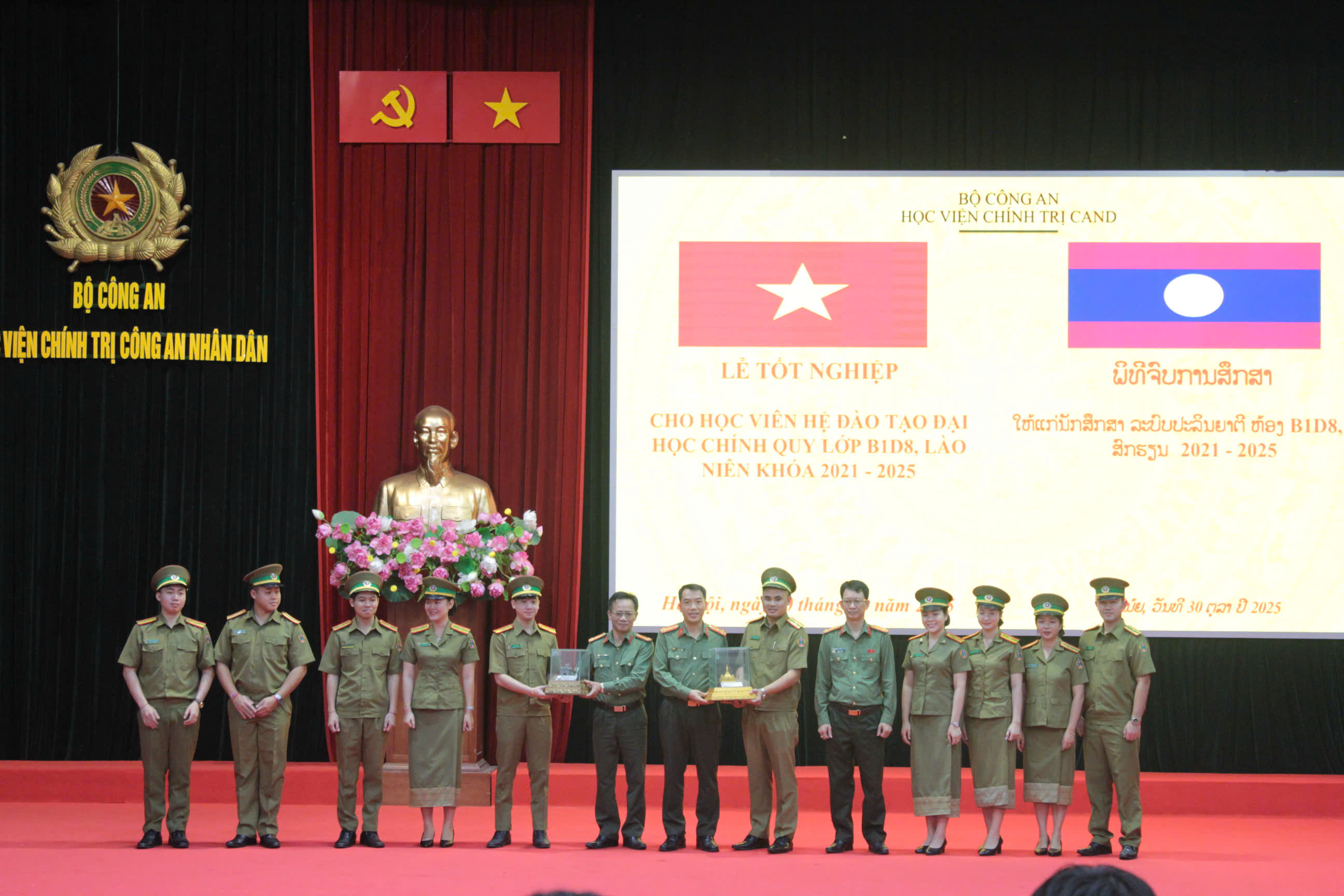 Chiều ngày 30/10/2025, Học viện Chính trị Công an nhân dân tổ chức Lễ tốt nghiệp cho học viên hệ đào tạo đại học chính quy lớp B1D8, Lào, niên khóa 2021 - 2025. Đồng chí Đại tá, TS Nguyễn Văn Tuấn, Ủy viên Ban Thường vụ Đảng ủy, Phó Giám đốc Học viện chủ trì buổi Lễ. các đồng chí lãnh đạo các đơn vị thuộc Học viện cùng toàn thể học viên khóa học.