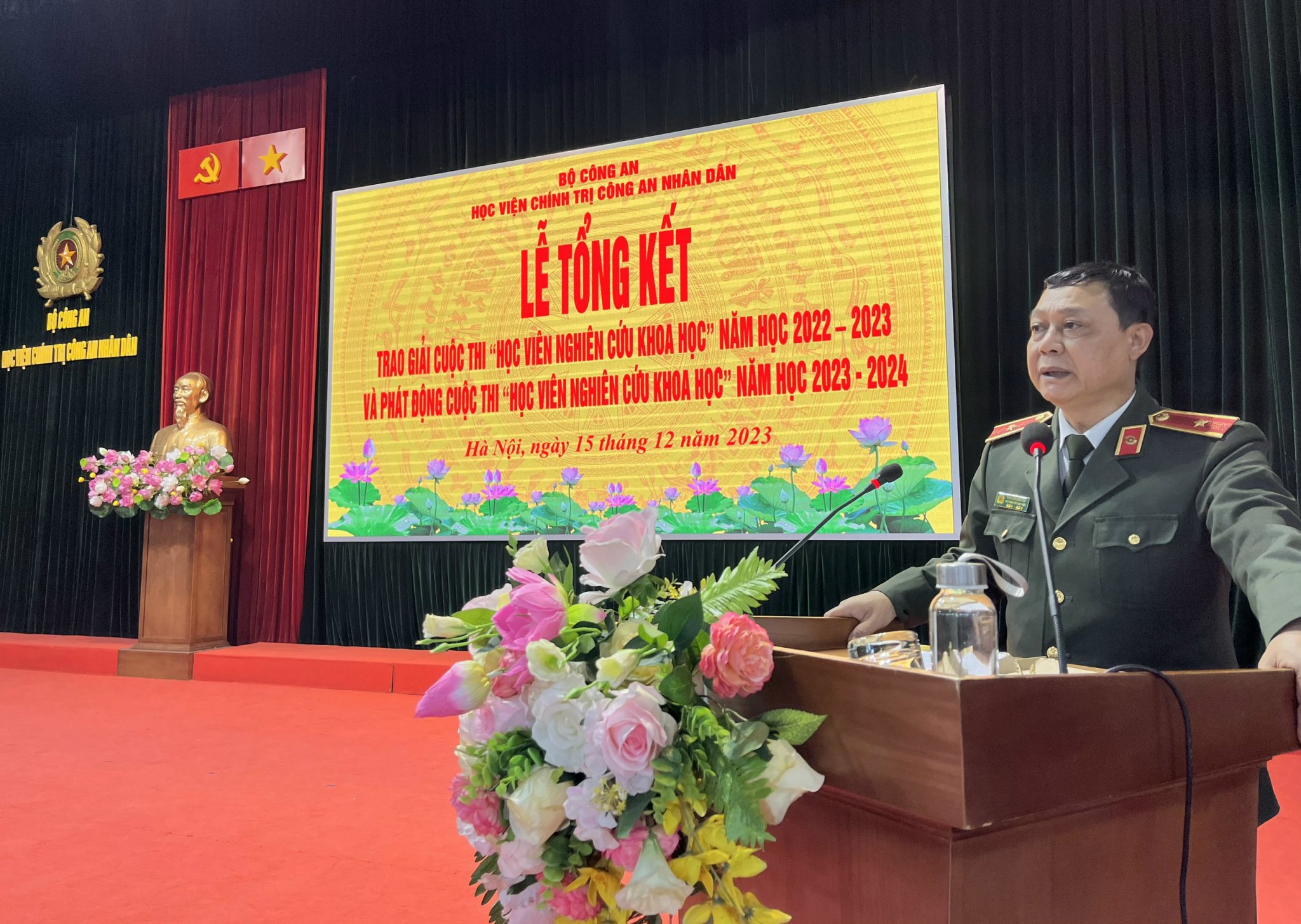 Phát biểu chỉ đạo tại buổi lễ, Thiếu tướng, TS Nguyễn Như Lôi, Phó Giám đốc Học viện ghi nhận, biểu dương và chúc mừng những tập thể, cá nhân đạt thành tích xuất sắc trong cuộc thi “Học viên nghiên cứu khoa học” năm học 2022 - 2023; ghi nhận sự nỗ lực của các đơn vị, cá nhân đã tham gia tổ chức thành công cuộc thi. Cùng với việc khẳng định vị trí, vai trò quan trọng của hoạt động nghiên cứu khoa học của học viên trong các trường đại học nói chung và Học viện Chính trị CAND nói riêng, đồng chí đã quán triệt mục tiêu, yêu cầu và một số nhiệm vụ trọng tâm mà Phòng Quản lý nghiên cứu khoa học và các đơn vị chức năng thuộc Học viện cần tập trung triển khai thực hiện, góp phần nâng cao hiệu quả hoạt động nghiên cứu khoa học của học viên nói chung, cuộc thi “Học viên nghiên cứu khoa học” năm học 2023 - 2024 nói riêng, qua đó hiện thực hoá mục tiêu nâng cao chất lượng các chuyên đề nghiên cứu khoa học và lựa chọn được những công trình thật sự xuất sắc, tiêu biểu để tham dự thi cuộc thi cấp Bộ.