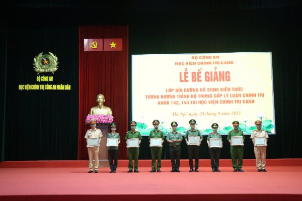 Ngày 28/9/2022, Học viện Chính trị Công an nhân dân tổ chức Lễ bế giảng lớp bồi dưỡng bổ sung kiến thức tương đương trình độ trung cấp lý luận chính trị khóa 142, 143 mở tại Học viện. Đồng chí Thiếu tướng, TS Nguyễn Như Lôi, Phó Giám đốc Học viện Chính trị Công an nhân dân chủ trì buổi Lễ. Tham dự có đại diện lãnh đạo các đơn vị thuộc Học viện cùng toàn thể học viên hai khóa học.