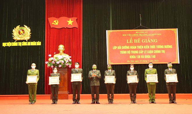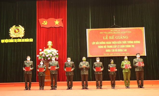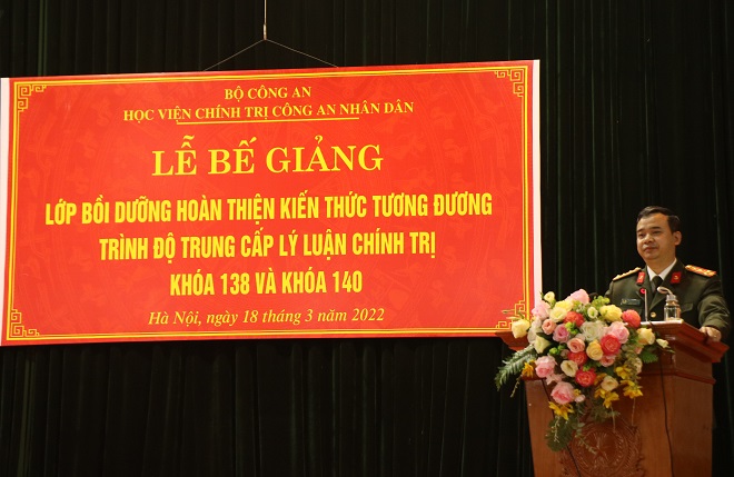 Sáng này 18/3/2022, Học viện Chính trị Công an nhân dân tổ chức lễ bế giảng Lớp bồi dưỡng hoàn thiện kiến thức tương đương trình độ trung cấp lý luận chính trị, Khóa 138 và Khóa 140. Đồng chí Đại tá Tống Văn Khuông, Phó Giám đốc Học viện Chính trị Công an nhân dân chủ trì buổi lễ. Tham dự có: đại diện lãnh đạo các đơn vị chức năng trong Học viện cùng toàn thể 150 học viên hai khóa học.