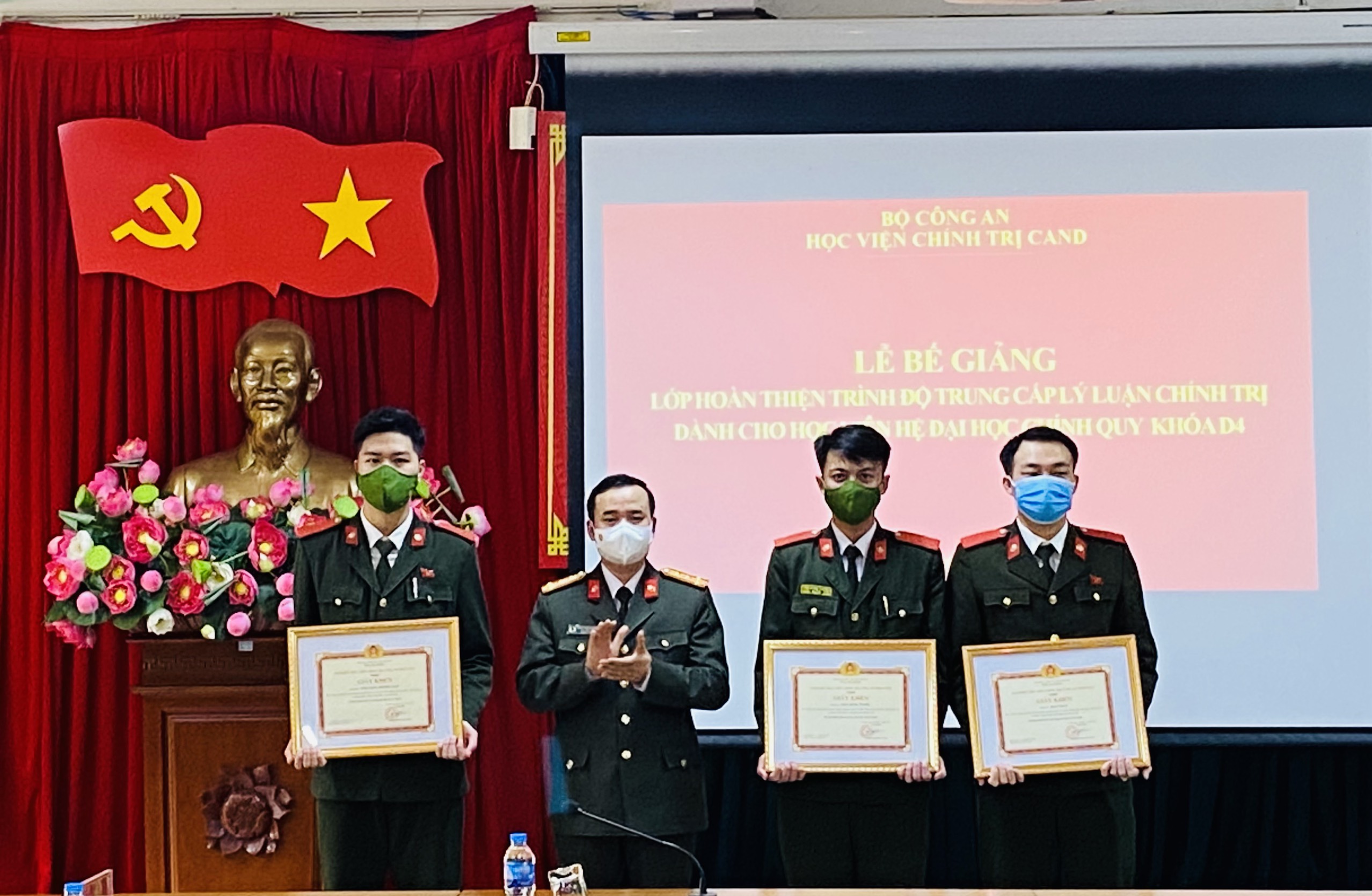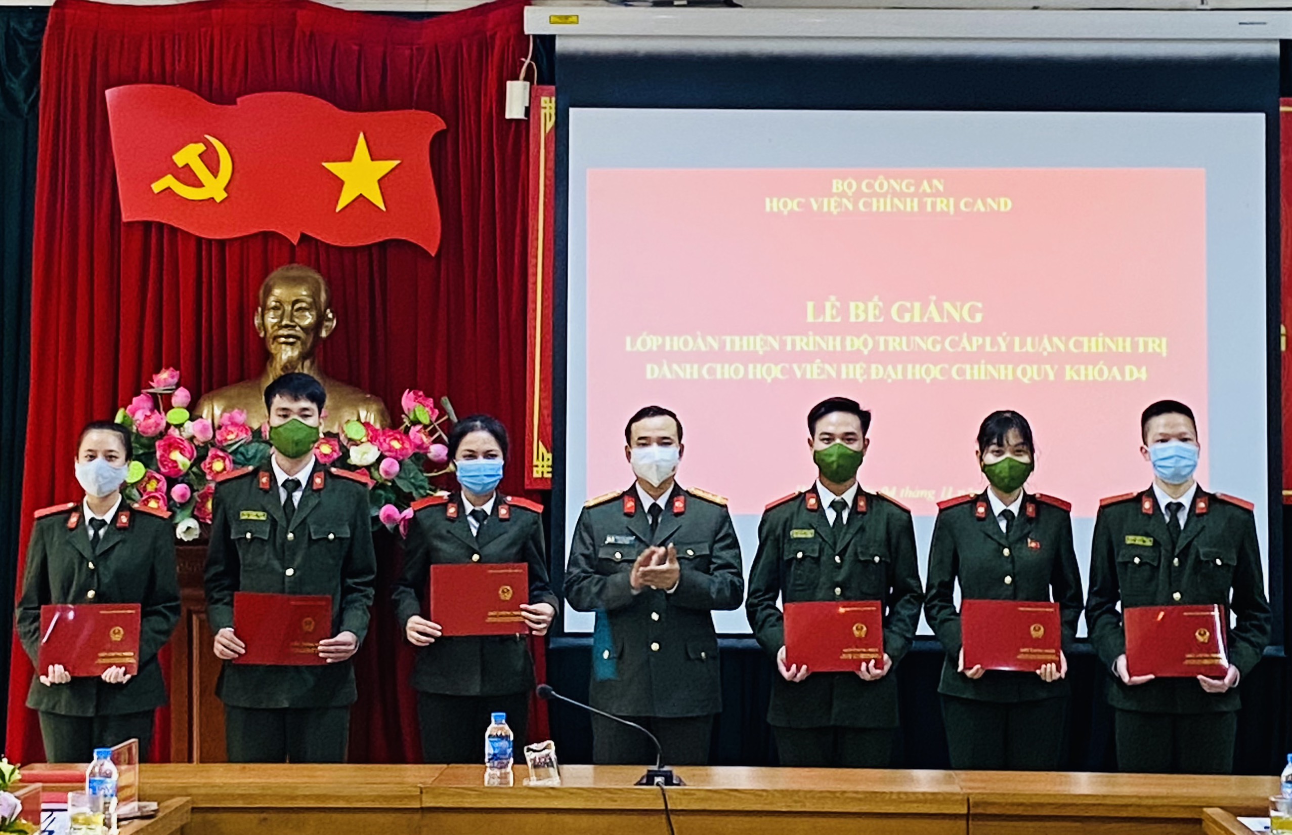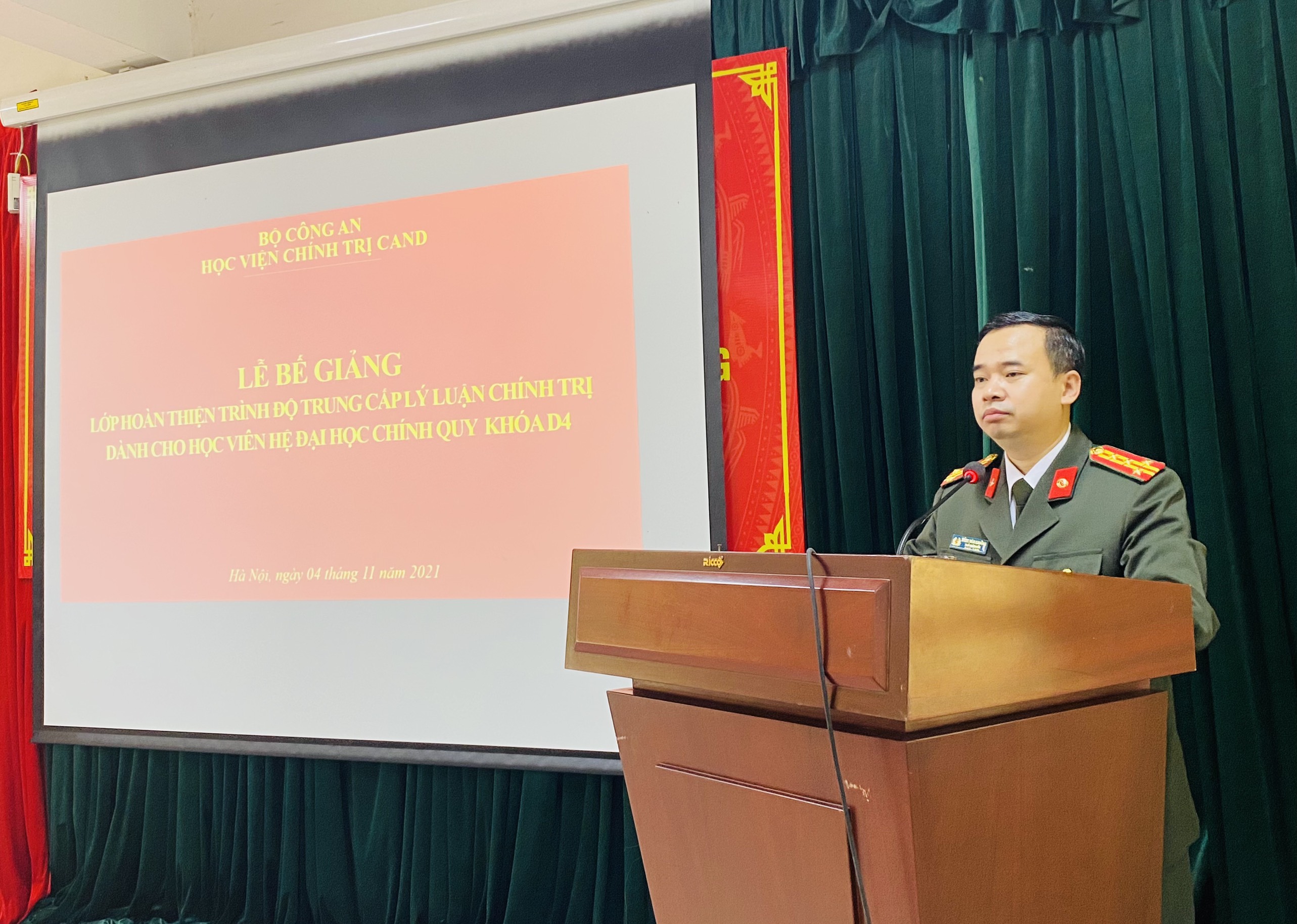 Ngày 04/11/2021, Học viện Chính trị Công an nhân dân tổ chức Lễ Bế giảng lớp bồi dưỡng hoàn thiện Trung cấp lý luận chính trị cho học viên hệ đại học chính quy Khóa D4. Đồng chí Đại tá Tống Văn Khuông, Phó Giám đốc Học viện chủ trì buổi lễ. Tham dự buổi lễ có đại diện lãnh đạo các đơn vị chức năng thuộc Học viện cùng toàn thể học viên lớp học.
