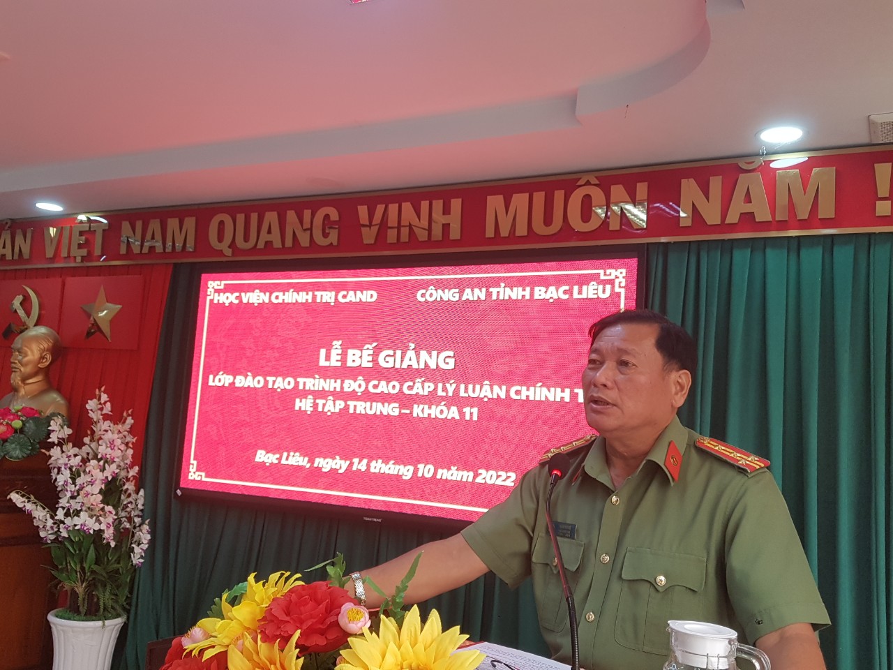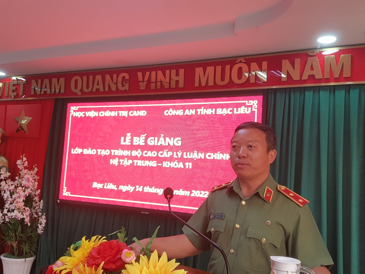 Phát biểu tại buổi lễ, đồng chí Đại tá Trần Phong, Phó Bí thư Đảng ủy, Phó Giám đốc Công an tỉnh Bạc Liêu cảm ơn và hi vọng rằng trong thời gian tới, Học viện Chính trị CAND tiếp tục phối hợp và giúp đỡ Công an tỉnh Bạc Liêu trong công tác tổ chức đào tạo, bồi dưỡng cán bộ chiến sỹ theo yêu cầu chuẩn hóa tiêu chuẩn cán bộ theo quy định của Đảng, Nhà nước và lực lượng CAND, đáp ứng nhiệm vụ bảo vệ an ninh trật tự trong tình hình mới. Đồng thời, đồng chí Phó Giám đốc Công an tỉnh biểu dương kết quả học tập của các học viên và yêu cầu ngay sau khi trở về đơn vị công tác, các học viên tiếp tục không ngừng trau dồi bản lĩnh chính trị và vận dụng tốt các kiến thức đã học vào nhiệm vụ thực tế công tác.