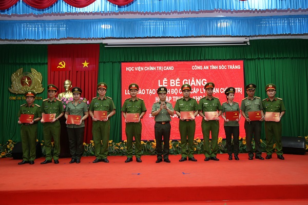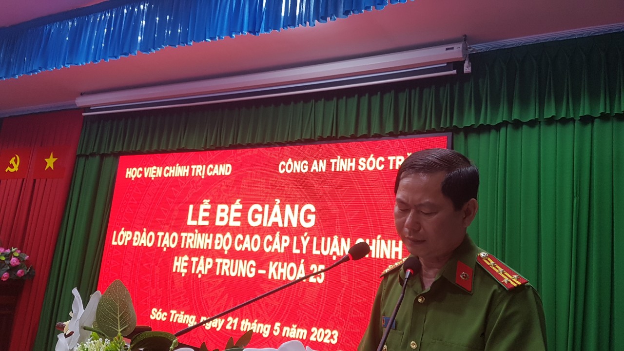 Thực hiện Kế hoạch số 1037/KH-T03-P3, ngày 15/5/2023 của Giám đốc Học viện Chính trị CAND về việc tổ chức Lễ bế giảng lớp đào tạo trình độ cao cấp LLCT, hệ tập trung - Khóa 25, sáng ngày 21/5/2023, Học viện Chính trị CAND phối hợp với Công an tỉnh Sóc Trăng long trọng tổ chức Lễ bế giảng khóa học. Đồng chí Trung tướng, PGS.TS Phan Xuân Tuy, Bí Thư Đảng ủy, Giám đốc Học viện Chính trị CAND dự và chủ trì buổi Lễ. Tham dự Lễ Bế giảng có đồng chí Đại tá Trần Văn Hòa, Ủy viên Ban Thường Đảng ủy, Phó Giám đốc Công an tỉnh Sóc Trăng; đồng chí Võ Hoàng Thơ, Phó Trưởng Ban Tổ chức tỉnh ủy; đồng chí TS Trần Thanh Sang, Phó Hiệu trưởng Trường Chính trị tỉnh Sóc Trăng; đại diện lãnh đạo Phòng Quản lý đào tạo và bồi dưỡng nâng cao, Học viện Chính trị CAND; đại diện lãnh đạo các đơn vị chức năng của Công an tỉnh Sóc Trăng cùng toàn thể học viên lớp học.