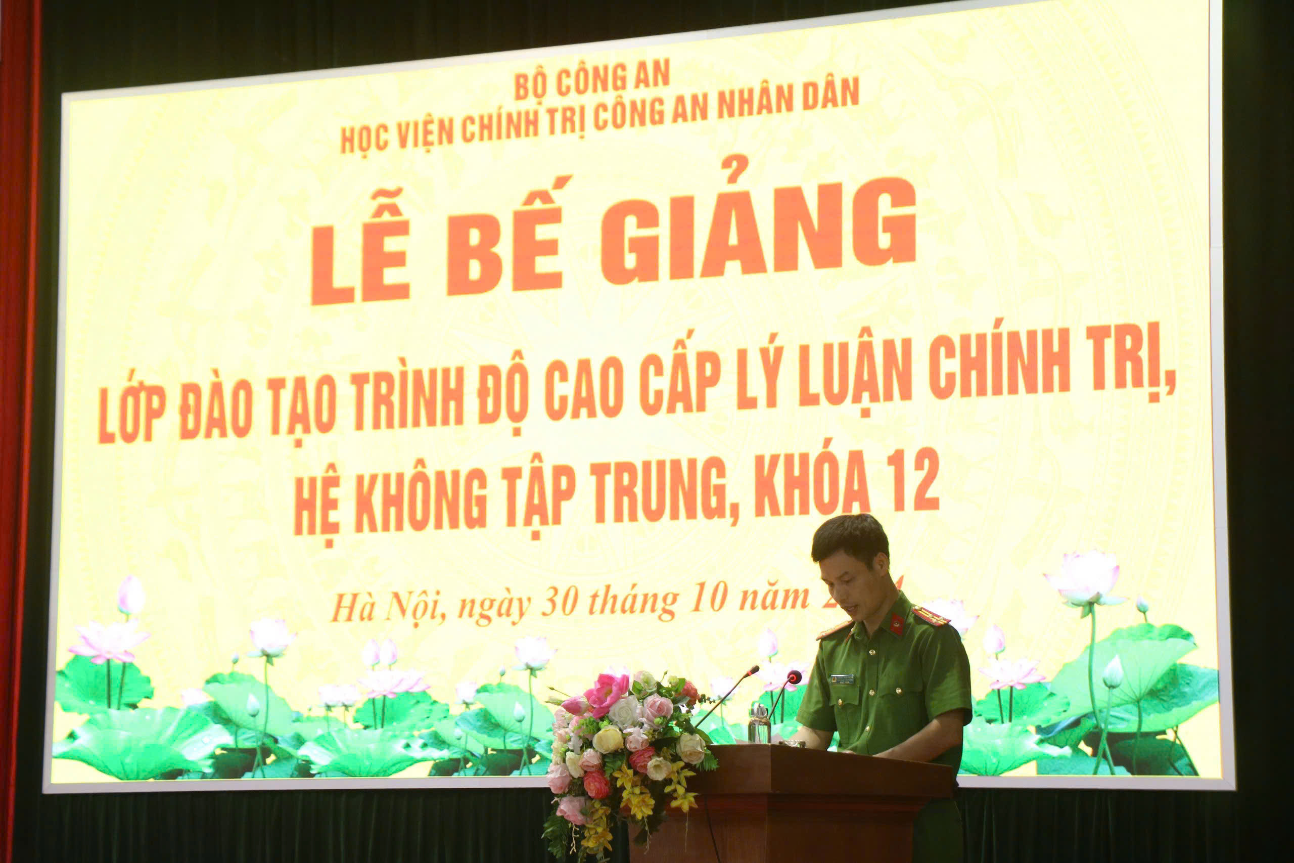 Thay mặt các học viên của khóa học, đồng chí Thượng tá Khuất Văn Khoản, Lớp trưởng phát biểu bày tỏ lòng biết ơn đến Đảng ủy, Ban Giám đốc Học viện Chính trị Công an nhân dân; các thầy, cô giáo đã tận tình, trách nhiệm, tạo điều kiện tốt nhất để học viên hoàn thành nhiệm vụ học tập, rèn luyện; đồng thời, xin hứa không ngừng học tập, rèn luyện, vận dụng hiệu quả kiến thức đã được học vào quá trình công tác.