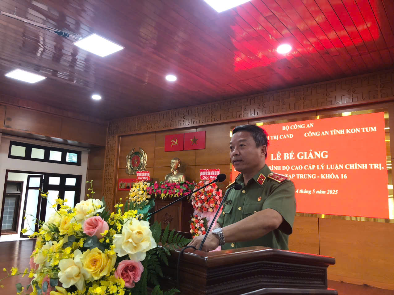 Lớp đào tạo trình độ Cao cấp lý luận chính trị hệ không tập trung, khóa 16, mở tại Công an tỉnh Kon Tum đã hoàn thành chương trình đào tạo trình độ cao cấp LLCT của lực lượng CAND ban hành kèm theo Quyết định số 1169/QĐ-BCA-X11, ngày 28/3/2018 của Bộ trưởng Bộ Công an; với đội ngũ giảng viên có trình độ, kinh nghiệm, uy tín của Học viện Chính trị CAND giảng dạy. Học viên lớp học đã hoàn thành chương trình học tập thực tế, thực hành chính trị - xã hội và hành trình về nguồn hướng tới kỷ niệm 80 năm Ngày truyền thống CAND và 20 năm Ngày hội toàn dân bảo vệ ANTQ tại các địa danh gồm: Căn cứ Trung ương Cục miền Nam huyện Tân Biên, tỉnh Tây Ninh; Chiến Khu Đ, tại địa bàn xã Ma Đa, huyện Vĩnh Cửu, tỉnh Đồng Nai; khu di tích địa đạo Củ Chi xã Phú Mỹ Hưng, huyện Củ Chi, thành phố Hồ Chí Minh. Học viện đã tổ chức cho học viên lớp học nghe đại diện Công an huyện Tân Biên báo cáo thực tế các nội dung theo Kế hoạch và tham gia các hoạt động thiện nguyện, trao quà tình nghĩa tại huyện Tân Biên, tỉnh Tây Ninh. Kết thúc khóa học, học viên lớp học đủ điều kiện đã được công nhận tốt nghiệp theo quy định.