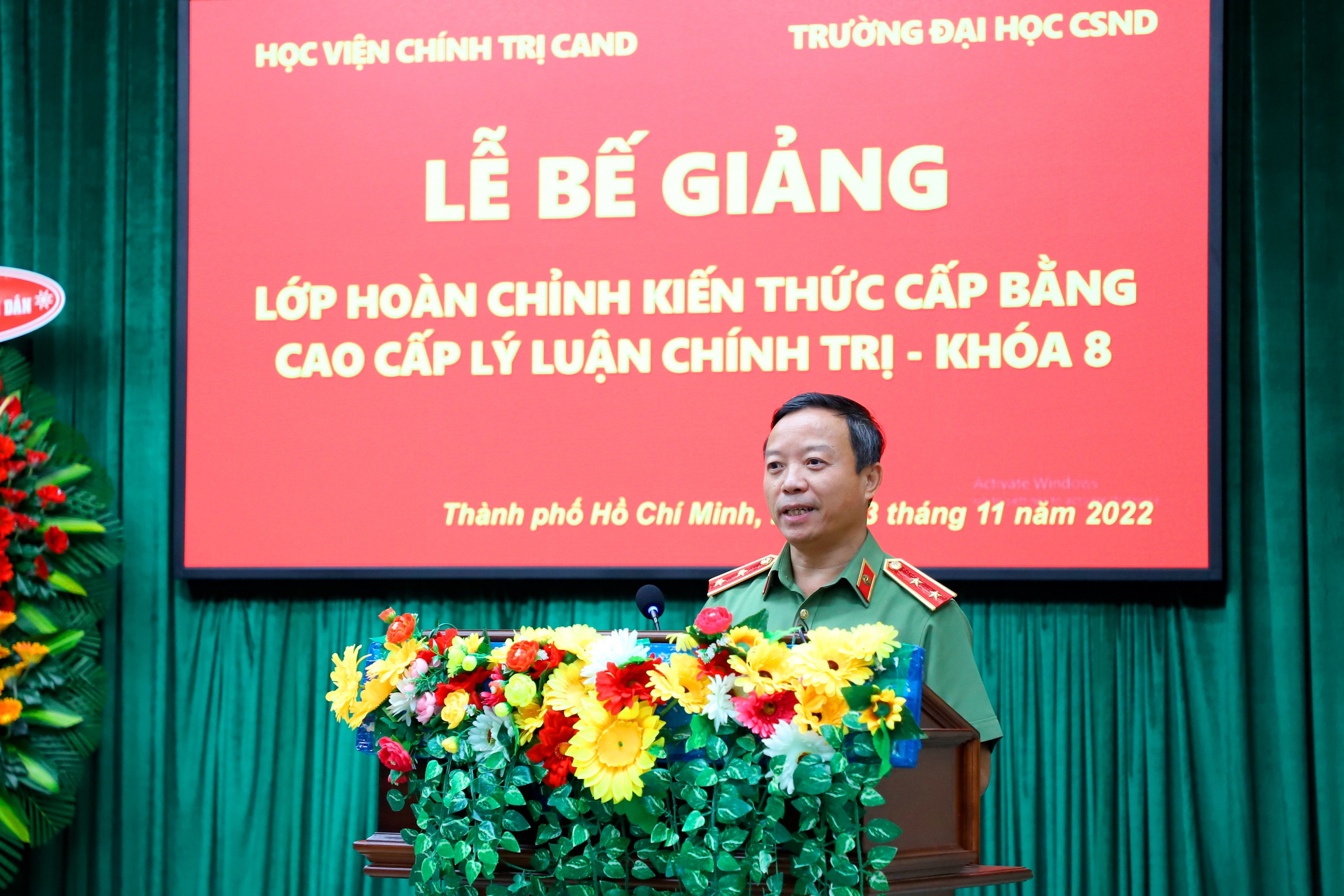 Phát biểu tại buổi Lễ, đồng chí Giám đốc Học viện cho biết lớp học được tổ chức trong bối cảnh tình hình dịch bệnh Covid-19 diễn biến phức tạp trên phạm vi toàn quốc nói chung và tại Thành phố Hồ Chí Minh nói riêng nhưng với sự lãnh đạo, chỉ đạo sát sao của Đảng ủy, Ban Giám đốc Học viện Chính trị CAND, Trường Đại học Cảnh sát nhân dân; sự cố gắng, nỗ lực của học viên lớp học và tinh thần, trách nhiệm cao của đội ngũ giảng viên, cán bộ quản lý, khoá học đã thành công, hoàn thành tốt mục tiêu, yêu cầu chương trình đào tạo đề ra. Trong đó, học viên tốt nghiệp xếp loại Giỏi chiếm tỷ lệ cao, nhiều học viên được tặng giấy khen. Đồng chí mong muốn các học viên sau khi hoàn thành khóa học, trở về đơn vị công tác sẽ luôn tích cực truyền bá những giá trị đạo đức cách mạng, đem những giá trị tri thức tiếp thu được trong quá trình học tập áp dụng vào thực tiễn công tác; phát huy vai trò là những hạt nhân trong các mặt công tác, nhất là công tác tuyên truyền, bảo vệ chủ nghĩa Mác - Lênin, tư tưởng Hồ Chí Minh, đường lối đổi mới của Đảng, Nhà nước, tạo sức lan tỏa mạnh mẽ trong các chi bộ, đảng bộ, cơ quan, đơn vị công tác, thực hiện thắng lợi các Nghị quyết của Bộ Chính trị Khóa XIII về phương hướng phát triển kinh tế - xã hội, bảo đảm quốc phòng, an ninh các vùng kinh tế - xã hội; Nghị quyết số 12-NQ/TW, ngày 16/3/2022 của Bộ Chính trị về đẩy mạnh xây dựng lực lượng CAND thật sự trong sạch, vững mạnh, chính quy, tinh nhuệ, hiện đại, đáp ứng yêu cầu, nhiệm vụ trong tình hình mới.