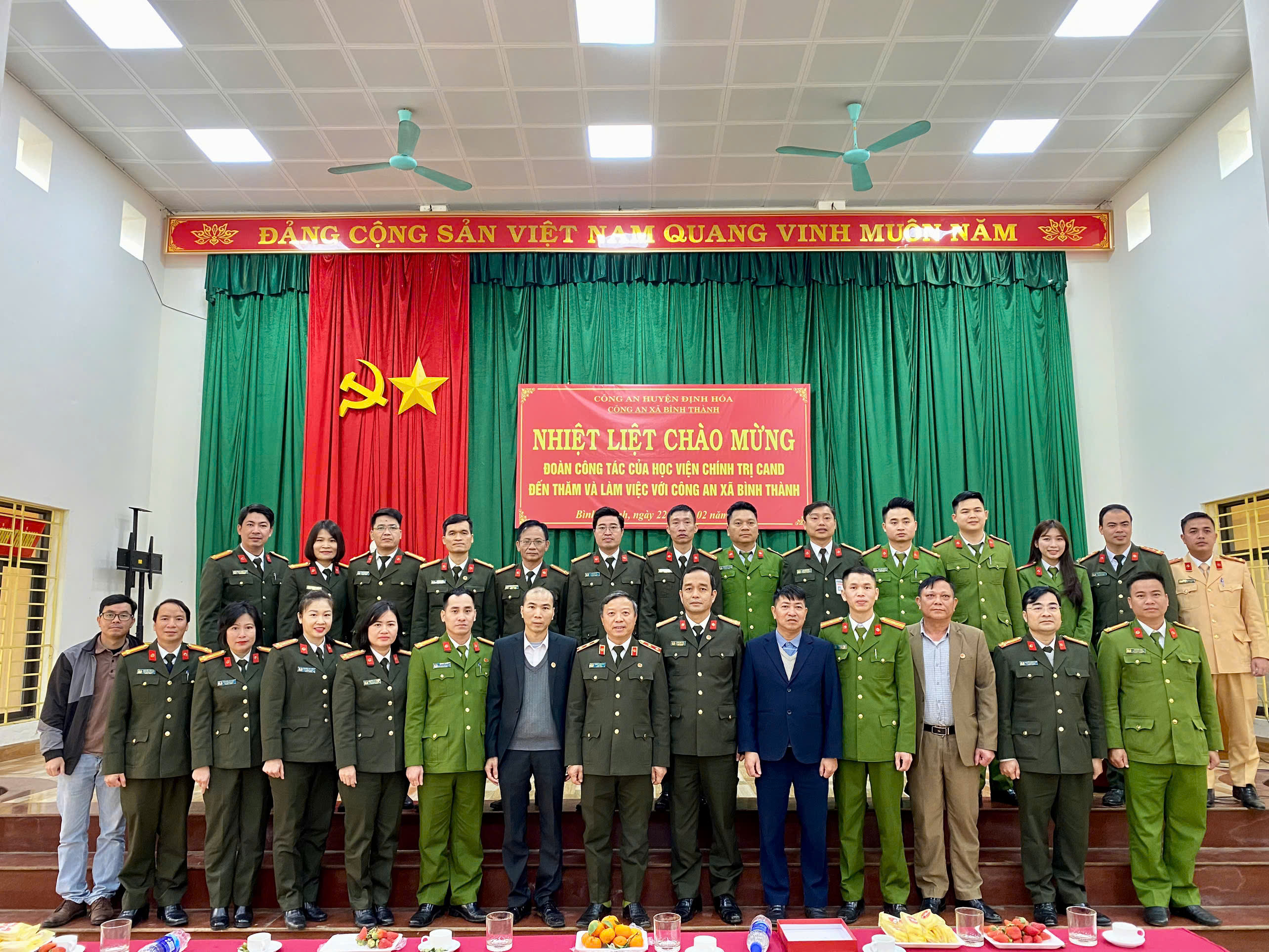 Nhân dịp này, Đoàn Công tác của Học viện đã tới thăm và tặng quà Công an xã Bình Thành, huyện Định Hóa, tỉnh Thái Nguyên (nơi Trường Đảng Nguyễn Ái Quốc đứng chân). Tại buổi làm việc, Đoàn Công tác đã được nghe đại diện Ban Chỉ huy Công an xã báo cáo tình hình và kết quả công tác thực hiện Kế hoạch tấn công trấn áp tội phạm, đảm bảo an ninh trật tự Tết Nguyên đán Ất Tỵ - 2025 của Bộ Công an, Công an tỉnh Thái Nguyên. Đồng chí PGS.TS.NGƯT, Trung tướng Phan Xuân Tuy, Bí thư Đảng ủy, Giám đốc Học viện, Trưởng Đoàn Công tác đánh giá cao những kết quả của Công an xã đã đạt được trong thời gian qua, chúc tập thể Công an xã hoàn thành xuất sắc chỉ tiêu công tác trong năm 2025, đảm bảo tốt công tác an ninh, trật tự an toàn xã hội tại địa bàn cơ sở. Đồng thời, đồng chí Bí thư Đảng ủy, Giám đốc Học viện nhấn mạnh vai trò, tầm quan trọng của đội ngũ cán bộ và công tác cán bộ đối với sự nghiệp cách mạng của Đảng nói chung, lực lượng CAND nói riêng. Triển khai thực hiện Kết luận số 94-KL/TW, ngày 28/3/2014 của Ban Bí thư về việc tiếp tục đổi mới việc học tập lý luận chính trị trong hệ thống giáo dục quốc dân; Kết luận số 91-KL/TW, ngày 12/8/2024 của Bộ Chính trị về thực hiện đổi mới căn bản, toàn diện giáo dục và đào tạo, trong thời gian vừa qua, các hoạt động đào tạo, nghiên cứu khoa học, tham mưu và hợp tác của Học viện đã được tập trung xây dựng, đổi mới góp phần triển khai thực hiện hiệu quả nhiệm vụ đào tạo các trình độ lý luận chính trị cho cán bộ Công an các đơn vị, địa phương theo Kết luận của Ban Bí thư giao Bộ Công an và trực tiếp là Học viện Chính trị CAND, góp phần xây dựng lực lượng CAND cách mạng, chính quy, tinh nhuệ, hiện đại, đáp ứng yêu cầu, nhiệm vụ trong tình hình mới.
