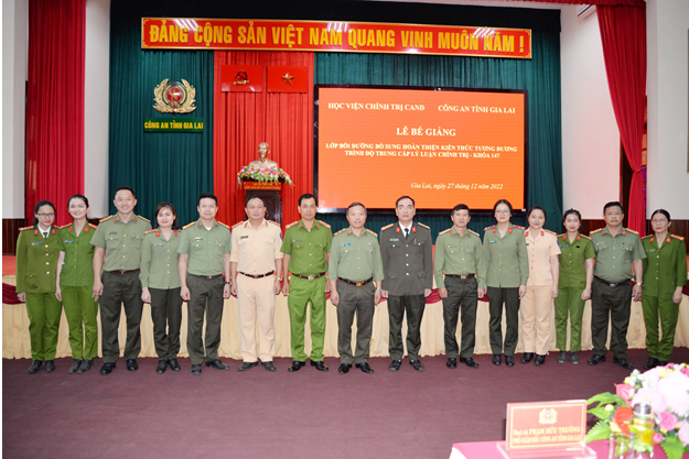 Lễ bế giảng lớp bồi dưỡng bổ sung hoàn thiện kiến thức tương đương trình độ Trung cấp lý luận chính trị, Khóa 147 mở tại Công an tỉnh Gia Lai đã diễn ra thành công tốt đẹp. Hy vọng rằng, khi trở về công tác, học viên sẽ vận dụng tốt các kiến thức đã được học vào thực tiễn nhằm đáp ứng yêu cầu nhiệm vụ chính trị trong tình hình mới, góp phần vào công tác xây dựng Đảng, xây dựng lực lượng Công an nhân dân theo tinh thần của Nghị quyết số 12-NQ/TW, ngày 16/3/2022 của Bộ Chính trị về “Đẩy mạnh xây dựng lực lượng CAND thật sự trong sạch, vững mạnh, chính quy, tinh nhuệ, hiện đại, đáp ứng yêu cầu, nhiệm vụ trong tình hình mới”./.