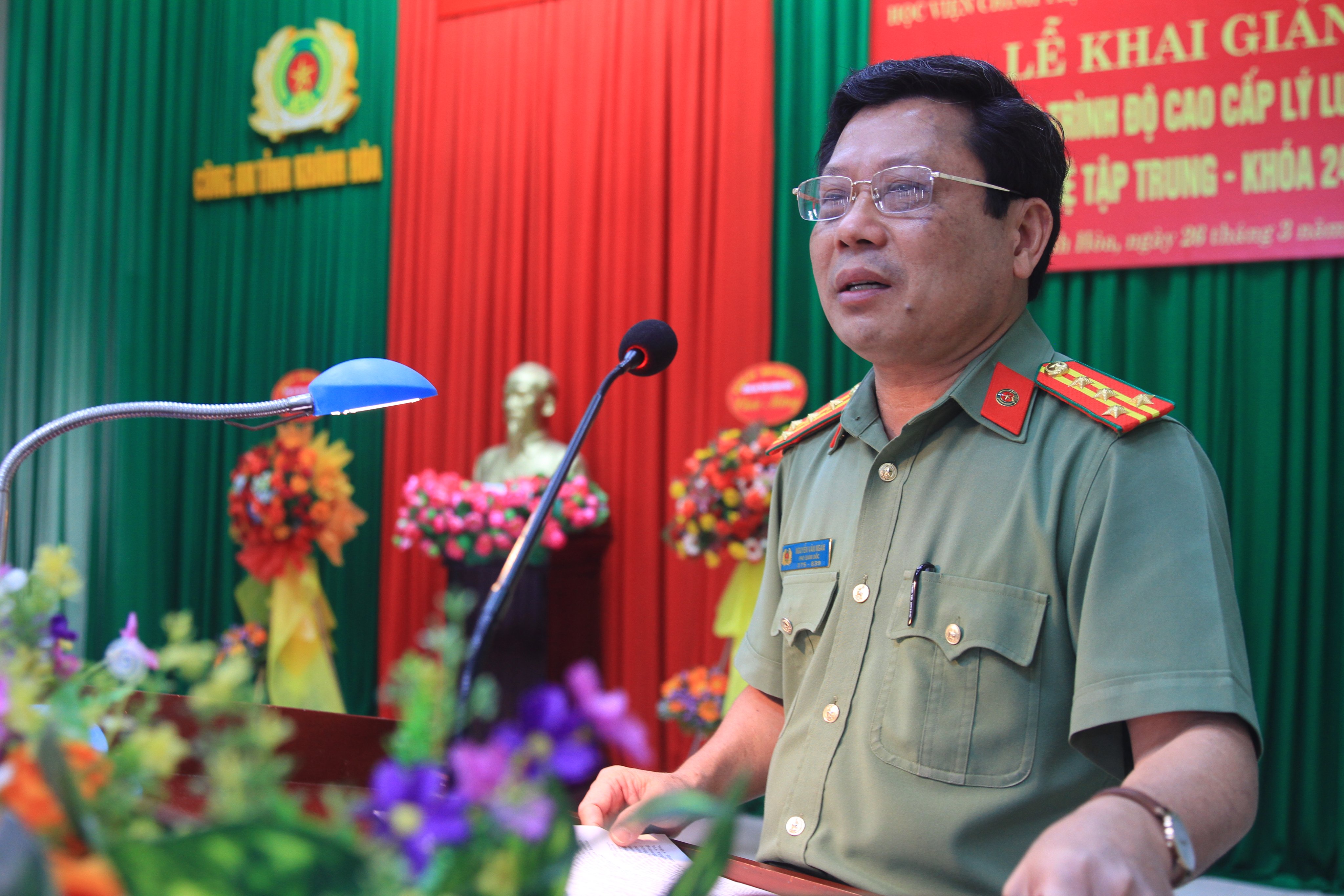 Thay mặt Đảng ủy, Ban Giám đốc Công an tỉnh Khánh Hòa, đồng chí Đại tá Nguyễn Văn Ngàn, Phó Bí thư Đảng ủy, Phó Giám đốc Công an tỉnh Khánh Hòa cảm ơn sự quan tâm của Ban Tổ chức Trung ương, các cơ quan tham mưu của Bộ Công an, sự phối hợp chặt chẽ của Học viện Chính trị Công an nhân dân để tổ chức khóa học và khẳng định Công an tỉnh Khánh Hòa sẽ tạo mọi điều kiện về cơ sở vật chất, trang thiết bị, phòng học đáp ứng yêu cầu và phối hợp với Học viện Chính trị Công an nhân dân trong công tác quản lý học viên theo đúng quy định góp phần tổ chức thành công khóa học.