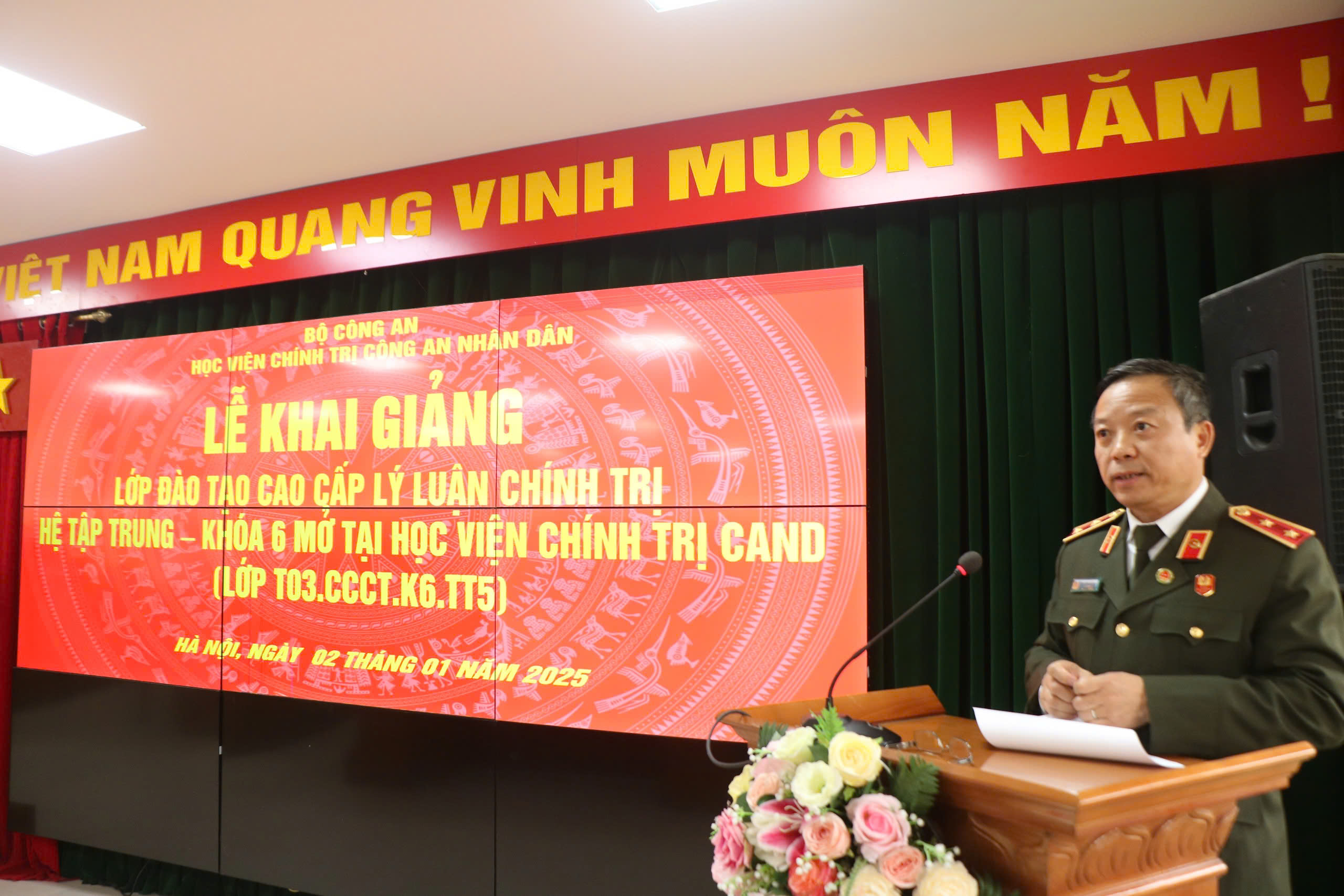Thực hiện Kế hoạch số 2680/KH-T03-P6, ngày 27/12/2024 của Học viện Chính trị CAND, ngày 02/01/2025, Học viện tổ chức khai giảng lớp đào tạo cao cấp LLCT hệ tập trung, khóa 6 – T03.CCCT.K6.TT5. Đồng chí Trung tướng, PGS. TS. NGƯT Phan Xuân Tuy, Bí thư Đảng ủy, Giám đốc Học viện Chính trị CAND chủ trì buổi lễ.