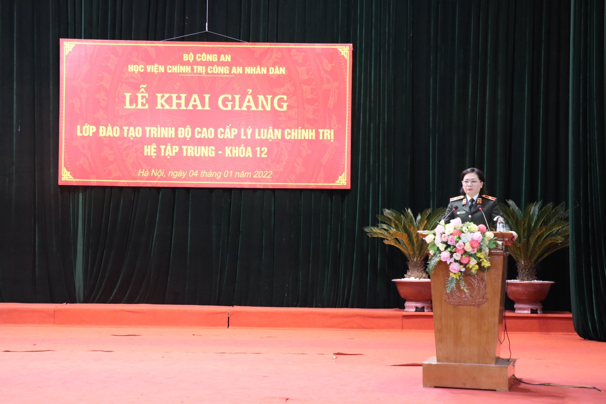 Phát biểu tại buổi lễ, đồng chí Thiếu tướng, PGS.TS Đinh Ngọc Hoa chúc mừng 50 đồng chí học viên đã trúng tuyển và tham gia khóa học; đồng thời gửi lời cảm ơn Cục Tổ chức cán bộ, Cục Đào tạo đã quan tâm, phối hợp với Học viện trong việc tổ chức mở lớp. Trong phát biểu khai giảng, đồng chí Phó Giám đốc Học viện đã nhấn mạnh với các đồng chí học viên về vai trò, ý nghĩa của việc học tập, bồi dưỡng lý luận chính trị và nhấn mạnh: Đây là nội dung mà Đảng ủy Công an Trung ương, lãnh đạo Bộ rất quan tâm; trong phát biểu chỉ đạo khi đến thăm, làm việc với Học viện Chính trị CAND, đồng chí Bộ trưởng và các đồng chí lãnh đạo Bộ đều căn dặn Học viện phải tập trung cho công tác đào tạo, bồi dưỡng lý luận chính trị cho cán bộ, lãnh đạo, chỉ huy các cấp trong CAND, không chỉ để chuẩn hóa chức danh, chức vụ mà quan trọng hơn là để đào tạo, bồi dưỡng nâng cao trình độ lý luận chính trị, bản lĩnh chính trị để có được đội ngũ cán bộ lãnh đạo, chỉ huy toàn diện, với nhận thức đầy đủ, sâu sắc về chủ nghĩa Mác - Lê nin, tư tưởng Hồ Chí Minh, quan điểm, chủ trương của Đảng, Nhà nước; cập nhật được tình hình, đổi mới tư duy, phương pháp luận và vận dụng vào thực tiễn công tác của đơn vị, địa phương gắn với chức trách, nhiệm vụ được giao. Học tập, bồi dưỡng lý luận chính trị là nhiệm vụ thường xuyên, cán bộ, đảng viên, nhất là đội ngũ lãnh đạo chỉ huy các cấp trong CAND phải xác định việc học tập, bồi dưỡng lý luận chính trị là trách nhiệm, nghĩa vụ và quyền lợi của bản thân. Bên cạnh đó, đồng chí Phó Giám đốc Học viện đã giới thiệu khái quát công tác bồi dưỡng các trình độ lý luận chính trị của Học viện Chính trị CAND thời gian qua và khẳng định, Học viện đã và đang khẳng định là cơ sở đào tạo, trung tâm nghiên cứu lý luận chính trị có uy tín trong CAND, là địa chỉ tin cậy để Công an các đơn vị, địa phương chọn cử cán bộ tham gia học tập. Lớp học được khai giảng và tổ chức học tập trong thời điểm những ngày đầu năm mới 2022, đồng thời là những ngày cuối của năm Tân Sửu trong bối cảnh các đơn vị, địa phương và cán bộ tham gia lớp học còn bộn bề công việc nhưng tất cả học viên đã nỗ lực, cố gắng khi tham dự khóa học cho thấy một tâm thế, niềm tin, sự quyết tâm lớn và kỳ vọng nhiều vào khóa học, thay mặt Thường vụ Đảng ủy, Ban Giám đốc Học viện, đồng chí Phó Giám đốc Học viện ghi nhận sự nỗ lực đó và chúc học viên lớp học sẽ có khóa học bổ ích, thành công.