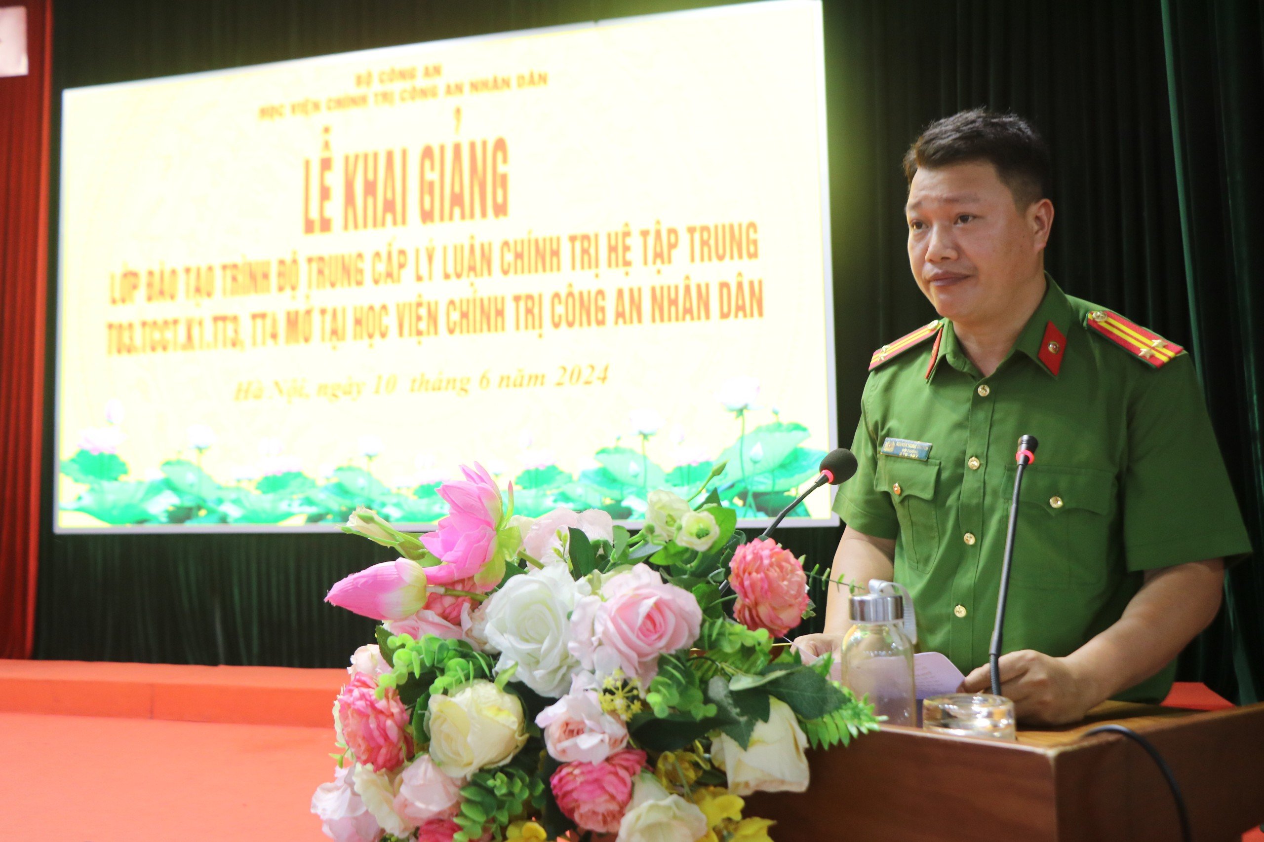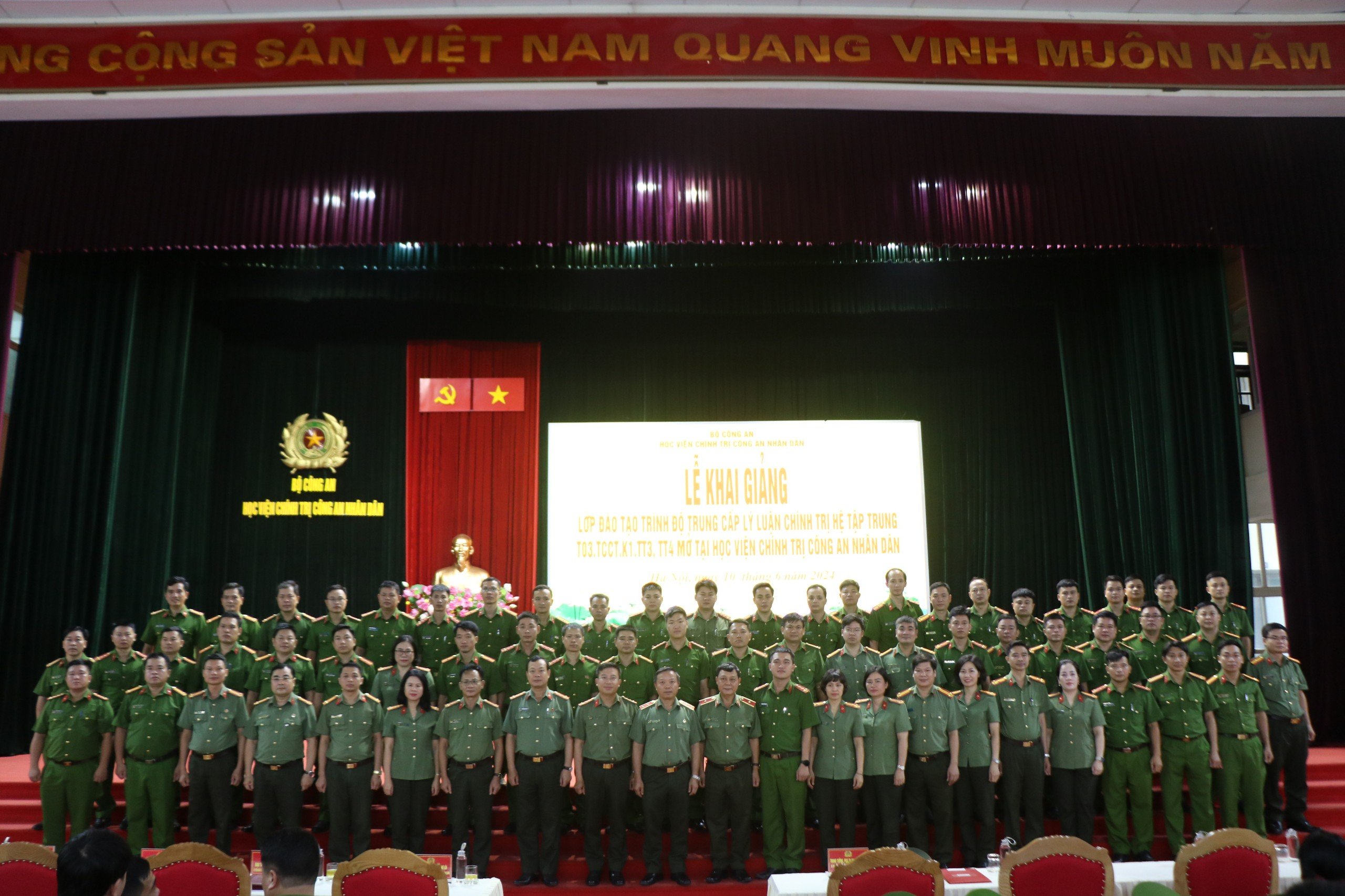 Thực hiện Kế hoạch số 1033/KH-T03-P6, ngày 06/6/2024 của Giám đốc Học viện Chính trị CAND về việc tổ chức Khai giảng Lớp đào tạo trình độ trung cấp lý luận chính trị hệ tập trung - T03.TCCC.TT3, TT4 khoá 1 mở tại Học viện Chính trị CAND; chiều ngày 10/6/2024, Học viện Chính trị Công an nhân dân đã long trọng triển khai tổ chức Lễ khai giảng 02 lớp học TT3, TT4. Đồng chí Trung tướng,PGS. TS Phan Xuân Tuy, Bí thư Đảng ủy, Giám đốc Học viện Chính trị CAND chủ trì buổi Lễ. Tham dự có đồng chí Đại tá, TS Nguyễn Anh Tuấn, Phó Cục trưởng Cục Đào tạo; Ban Giám đốc Học viện; đại diện lãnh đạo các đơn vị chức năng thuộc Học viện Chính trị CAND và toàn thể học viên hai lớp học.