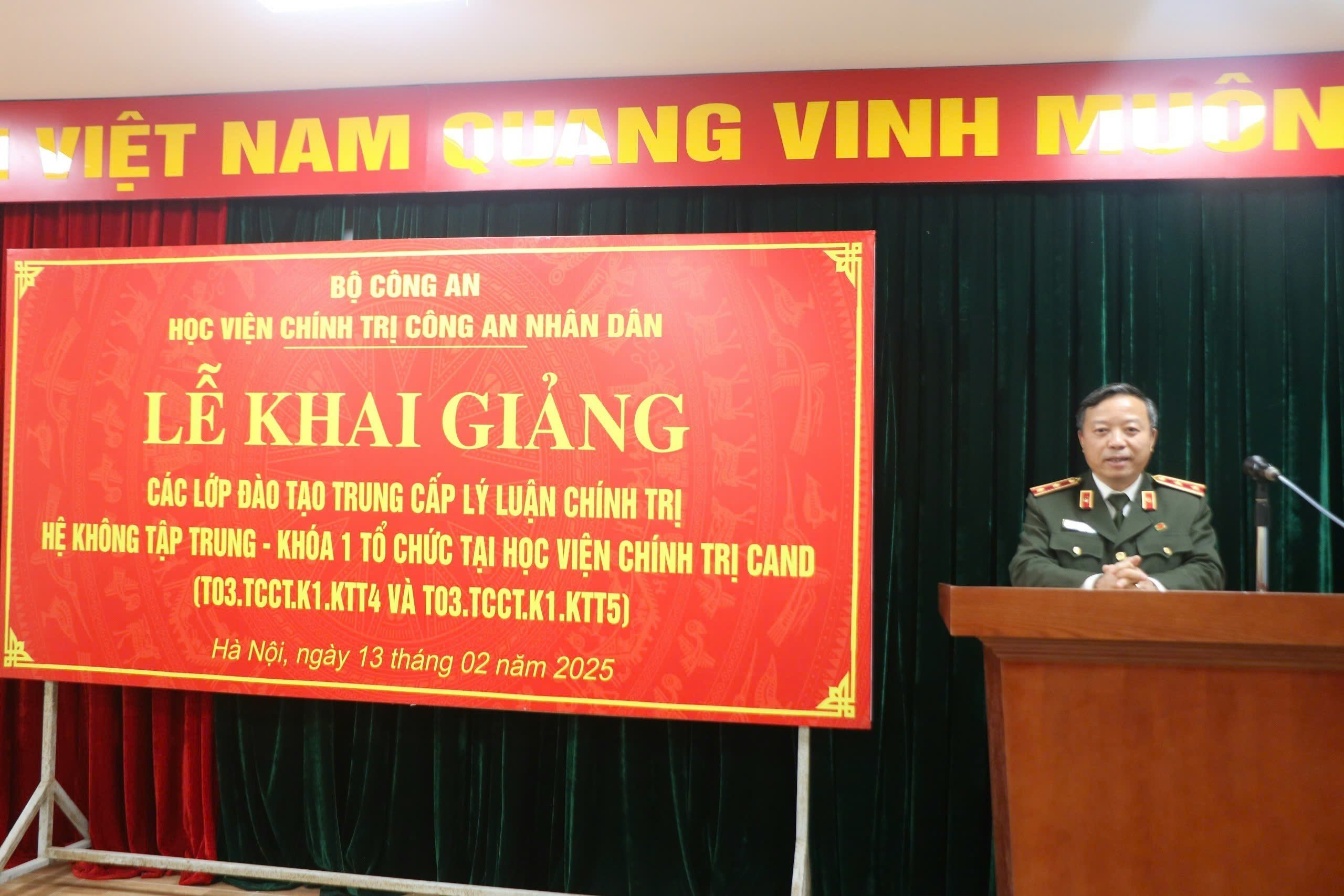 Ngày 13/02/2025, Học viện Chính trị Công an nhân dân tổ chức lễ khai giảng lớp đào tạo Trung cấp lý luận chính trị, hệ không tập trung, khóa 1 (lớp T03.TCCT.K1.KTT4 và T03.TCCT.K1.KTT5). Đồng chí PGS.TS, Trung tướng Phan Xuân Tuy, Bí thư Đảng ủy, Giám đốc Học viện chủ trì buổi lễ. Tham dự buổi lễ có đại diện lãnh đạo Cục Đào tạo Bộ Công an, các đơn vị chức năng thuộc Học viện cùng toàn thể học viên lớp học.