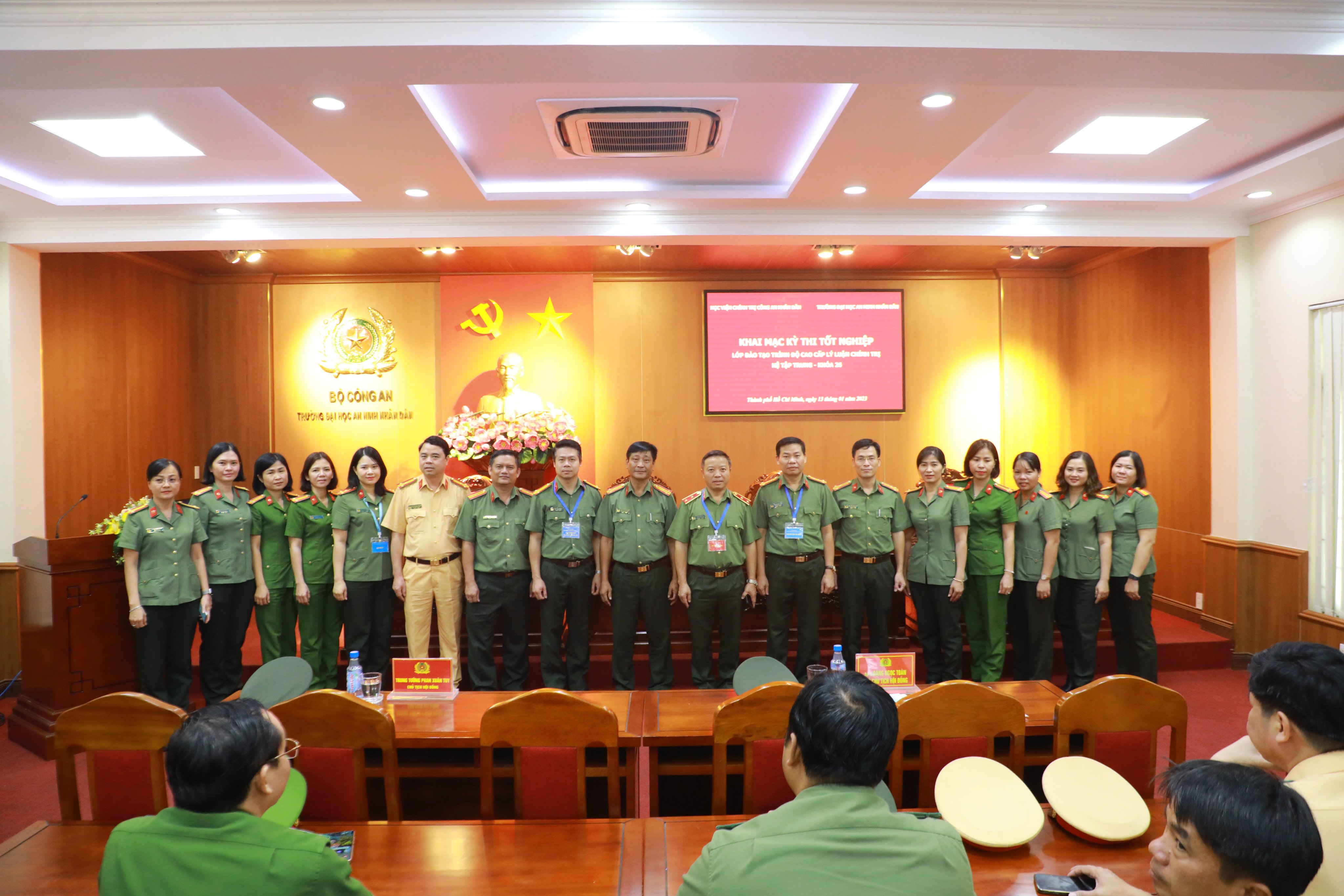 Thực hiện Kế hoạch số 48/KH-T03-P3 ngày 06/01/2023 của Học viện Chính trị Công an nhân dân về việc tổ chức thi tốt nghiệp cho lớp đào tạo trình độ cao cấp lý luận chính trị, hệ tập trung - Khóa 26; sáng ngày 13/01/2023, Học viện Chính trị Công an nhân dân chủ trì, phối hợp với Trường Đại học An ninh nhân dân tổ chức khai mạc kỳ thi tốt nghiệp cho học viên khóa học. Đồng chí Trung tướng, PGS.TS Phan Xuân Tuy, Bí thư Đảng ủy, Giám đốc Học viện Chính trị Công an nhân dân, Chủ tịch Hội đồng thi chủ trì buổi lễ; tham dự có đồng chí Đại tá, PGS.TS Đặng Ngọc Toàn, Phó Hiệu trưởng Trường Đại học An ninh nhân dân, Phó Chủ tịch Hội đồng thi; đại diện lãnh đạo các đơn vị chức năng của Học viện Chính trị Công an nhân dân, Trường Đại học An ninh nhân dân cùng toàn thể học viên lớp học.