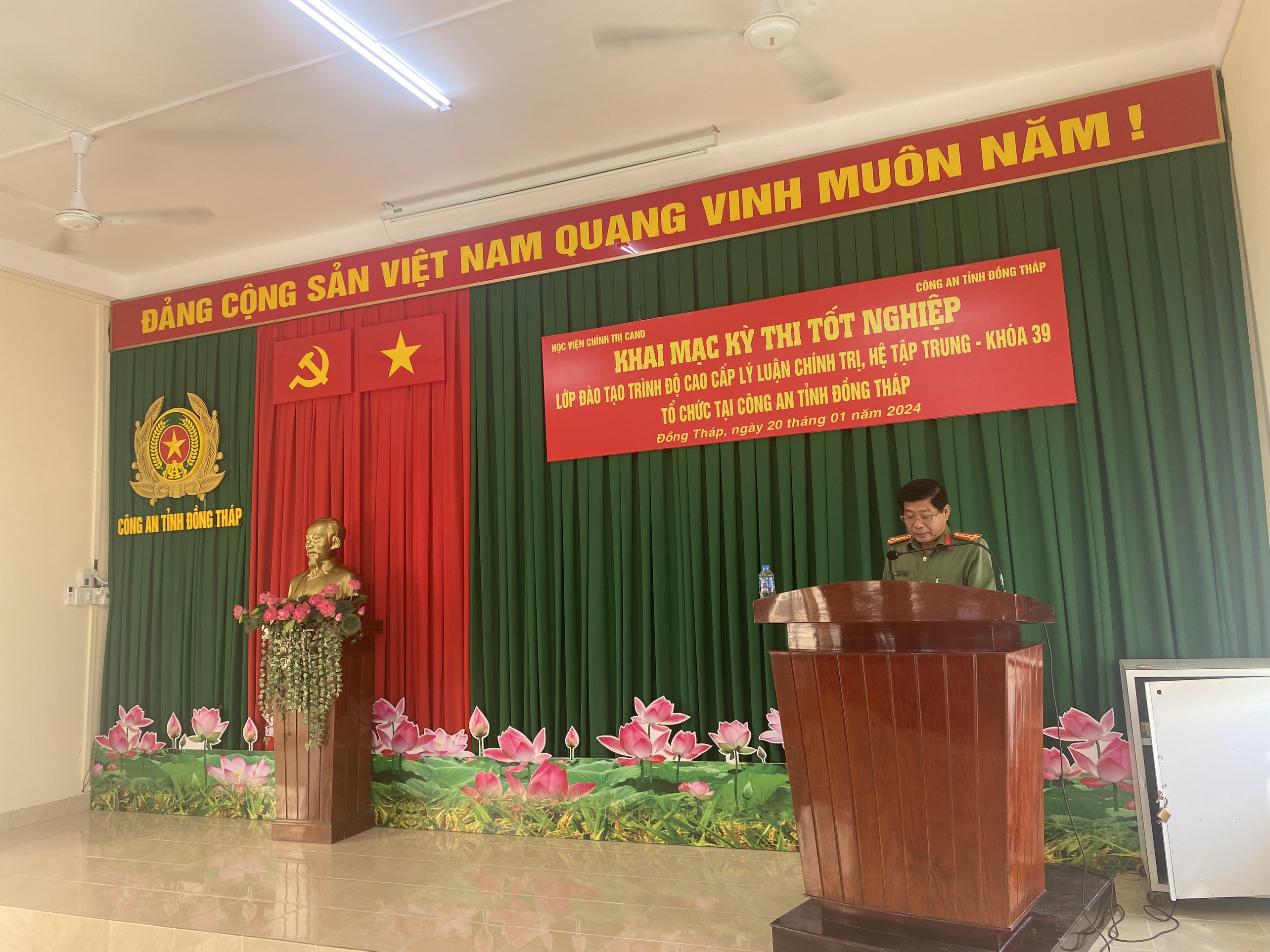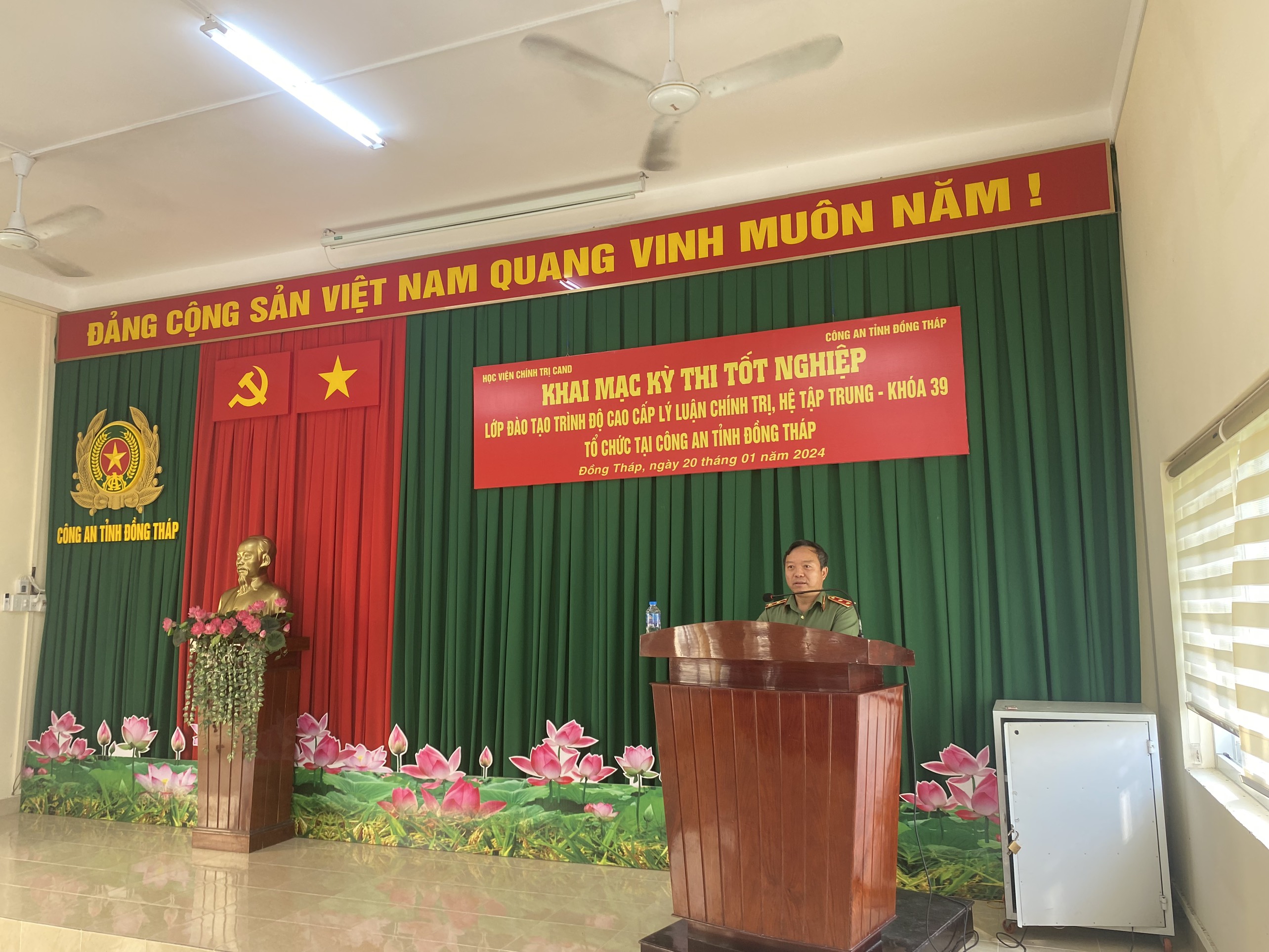Phát biểu khai mạc kỳ thi, đồng chí Giám đốc Học viện, Chủ tịch Hội đồng thi tốt nghiệp đã khái quát một số nội dung quan trọng trong quá trình tổ chức đào tạo lớp cao cấp lý luận chính trị, hệ tập trung - Khóa 39, đây là lớp đào tạo trình độ cao cấp LLCT cho Tỉnh ủy Đồng Tháp, đào tạo cán bộ có nguồn nhân lực chất lượng cao cho Công an tỉnh Đồng Tháp góp phần thực hiện thắng lợi Nghị quyết số 13-NQ/TW ngày 2/4/2022 của Bộ Chính trị về phương hướng phát triển kinh tế - xã hội, bảo đảm quốc phòng, an ninh vùng Đồng bằng sông Cửu Long đến năm 2030, tầm nhìn đến năm 2045. Đồng chí Giám đốc Học viện, Chủ tịch Hội đồng thi tốt nhiệp nhấn mạnh tính chất nghiêm túc của kỳ thi tốt nghiệp và khẳng định Hội đồng thi tốt nghiệp đã họp, duyệt tư cách thi cho học viên lớp học nghiêm túc theo đúng quy chế, quy định. Đồng chí Giám đốc Học viện cũng ghi nhận, biểu dương sự nỗ lực cố gắng của các đơn vị chức năng thuộc Học viện Chính trị CAND và Công an tỉnh Đồng Tháp trong công tác phối hợp triển khai lớp học đảm bảo chất lượng và tiến độ theo Kế hoạch đã đề ra; học viên lớp học đã chấp hành nghiêm Quy chế đào tạo, quy định của Học viện và địa phương nơi phối hợp tổ chức mở lớp.