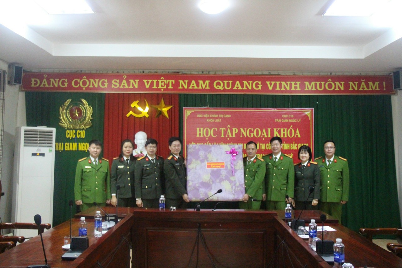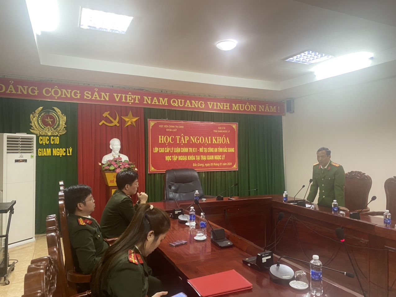 Thực hiện Kế hoạch số 20/KH-T03-K4, ngày 05/01/2024 của Khoa Luật, Học viện Chính trị CAND về việc tổ chức học tập ngoại khóa cho lớp đào tạo trình độ cao cấp lý luận chính trị, hệ không tập trung - Khóa 11, mở tại Công an tỉnh Bắc Giang và được sự đồng ý của Ban Giám đốc Học viện, ngày 09/01/2023 Khoa Luật, Học viện Chính trị CAND tổ chức buổi học tập ngoại khóa với nội dung: “Thực hiện quy định của pháp luật về quyền của phạm nhân tại Trại giam Ngọc Lý” cho học viên lớp học.