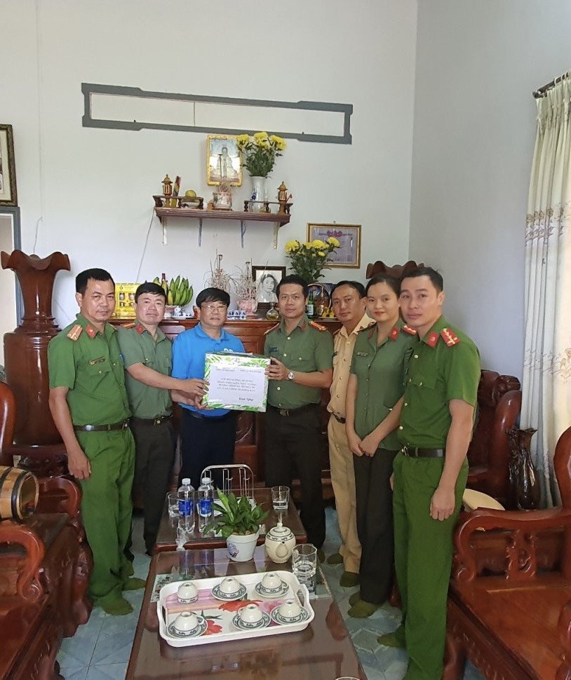 Đoàn công tác thăm hỏi, trao quà cho đồng chí Đỗ Thế Thành là thương binh loại A, trong khi thực hiện nhiệm vụ chống biểu tình bạo loạn tại xã Glar, đồng chí bị các đối tượng chống đối tấn công làm hỏng 01 mắt.