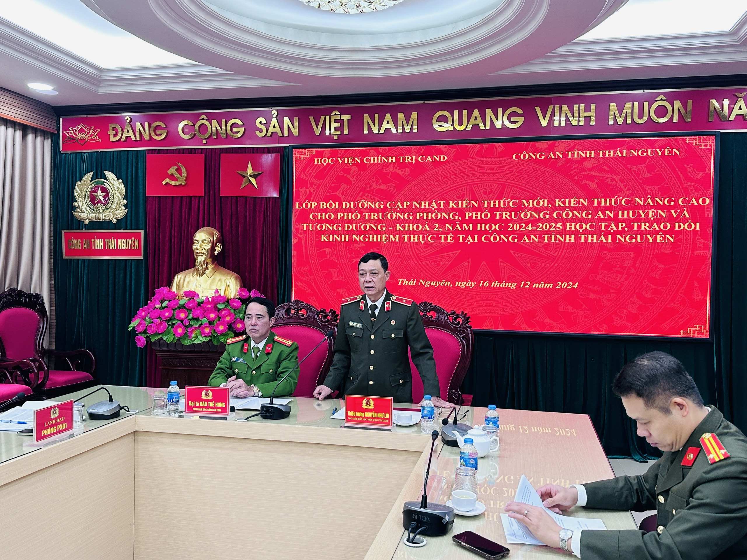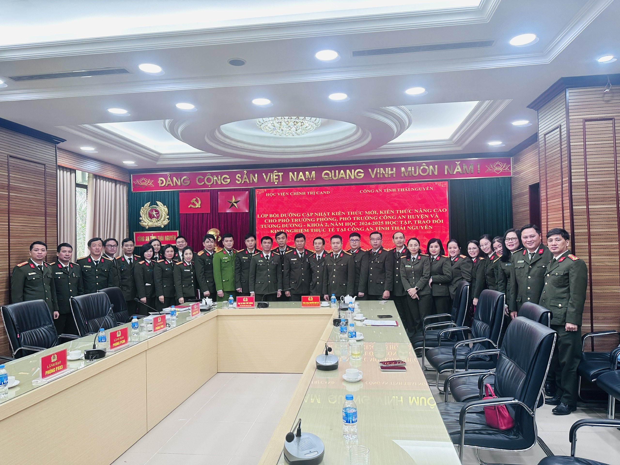 Ngày 16/12/2024, Học viện Chính trị Công an nhân dân tổ chức cho học viên Lớp Bồi dưỡng cập nhật kiến thức mới, kiến thức nâng cao đối với Phó Trưởng phòng, Phó Trưởng Công an huyện và tương đương - Khóa 2, năm học 2024 - 2025 đi học tập, trao đổi kinh nghiệm thực tế tại Công an tỉnh Thái Nguyên. Được sự phân công của đồng chí Giám đốc Học viện, đồng chí Thiếu tướng, TS Nguyễn Như Lôi, Phó Bí thư Đảng ủy, Phó Giám đốc Học viện Chính trị Công an nhân dân làm Trưởng đoàn Đoàn công tác. Tham gia Đoàn còn có đại diện lãnh đạo Phòng Quản lý đào tạo và bồi dưỡng nâng cao cùng toàn thể học viên của lớp bồi dưỡng.