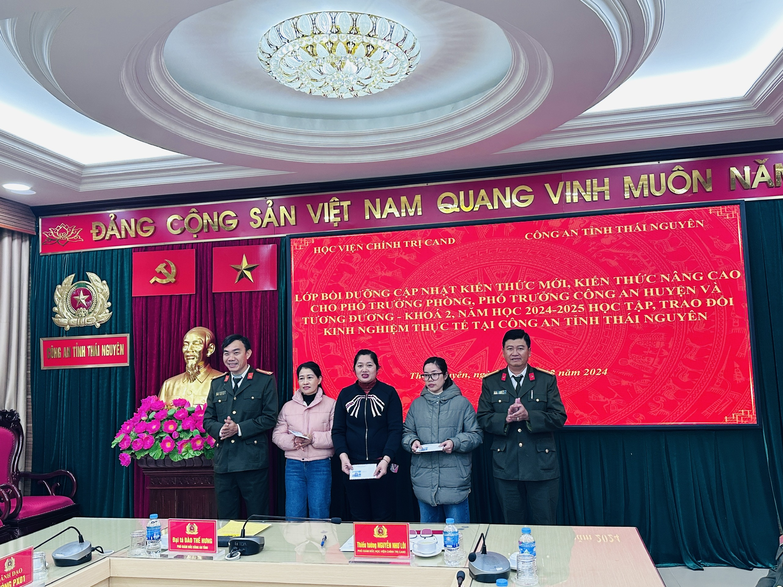 Thay mặt cho học viên lớp học, đồng chí Thượng tá Lê Minh Tuyên, lớp phó đã bày tỏ niềm vui, sự cảm ơn đối với Ban Giám đốc Học viện Chính trị Công an nhân dân, Công an tỉnh Thái Nguyên đã tạo điều kiện để lớp học có buổi học tập, trao đổi thực tế chất lượng, thiết thực, hiệu quả, bổ ích. Nhân dịp buổi học tập thực tế, Đoàn Công tác của Học viện và học viên lớp học đã trao 03 suất quà cho các gia đình cán bộ có hoàn cảnh khó khăn. Đây là hoạt động mang ý nghĩa nhân văn, thể hiện nghĩa tình đồng chí, đồng đội.