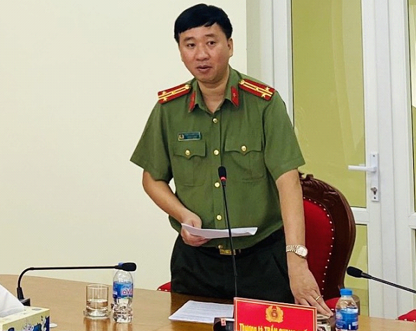 Đồng chí Thượng tá Trần Quang Tuấn, Ủy viên Ban Thường vụ Đảng ủy, Trưởng phòng Tổ chức cán bộ, Công an tỉnh Quảng Ninh trao đổi các nội dung với đoàn công tác