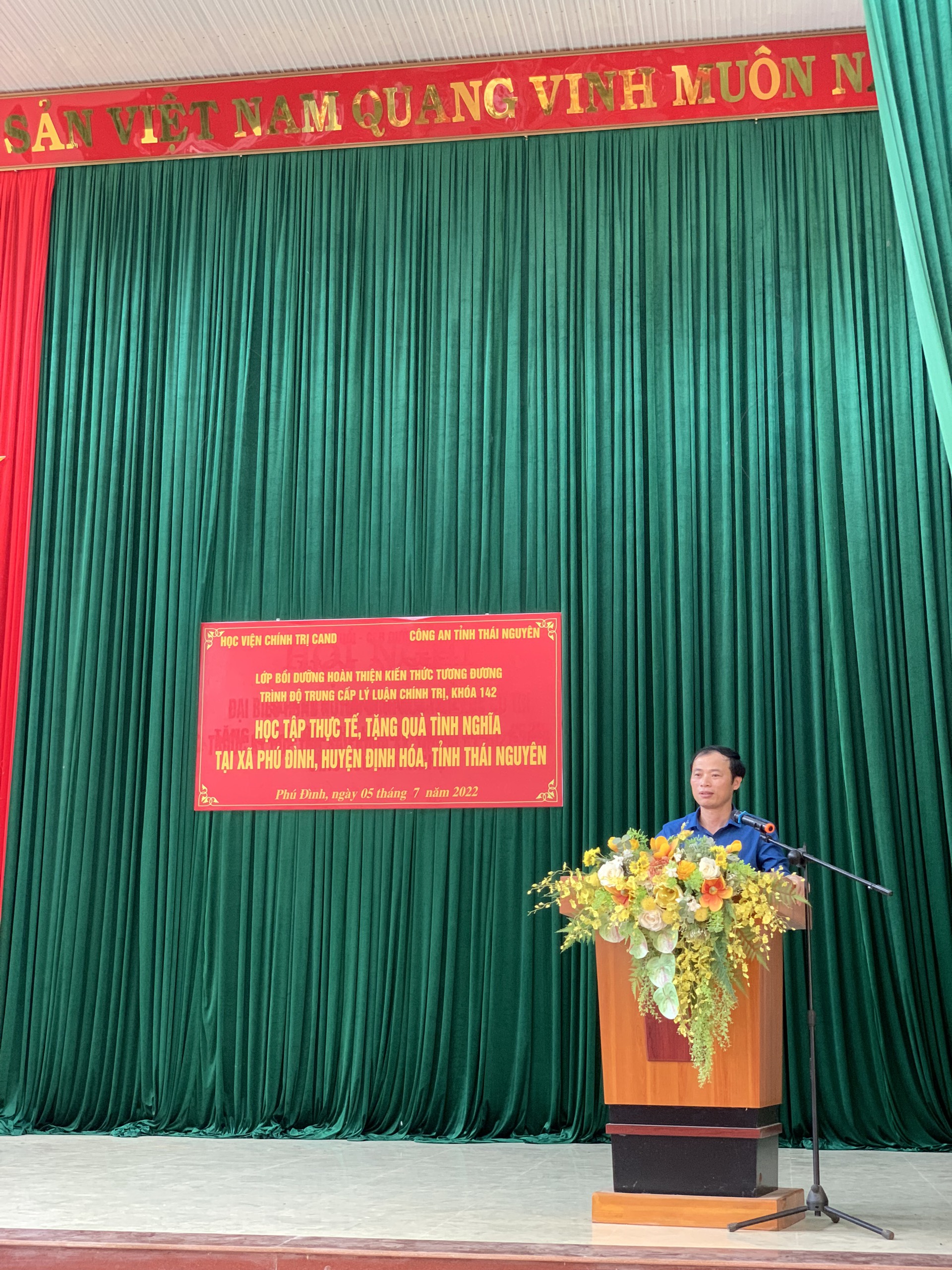 Ngày 05/7/2022, Học viện Chính trị Công an nhân dân tổ chức cho học viên Lớp bồi dưỡng hoàn thiện kiến thức tương đương trình độ Trung cấp lý luận chính trị, Khóa 142 đi học tập thực tế, tặng quà tình nghĩa tại xã Phú Đình, huyện Định Hóa, tỉnh Thái Nguyên. Thừa ủy quyền của Ban Giám đốc Học viện, đồng chí Trung tá Nguyễn Đình Thi, Phó Trưởng phòng Phòng Quản lý đào tạo và bồi dưỡng nâng cao làm Trưởng đoàn. Tham gia Đoàn còn có các đồng chí cán bộ Phòng Quản lý đào tạo và bồi dưỡng nâng cao, Phòng Quản lý học viên và toàn thể học viên của lớp bồi dưỡng.