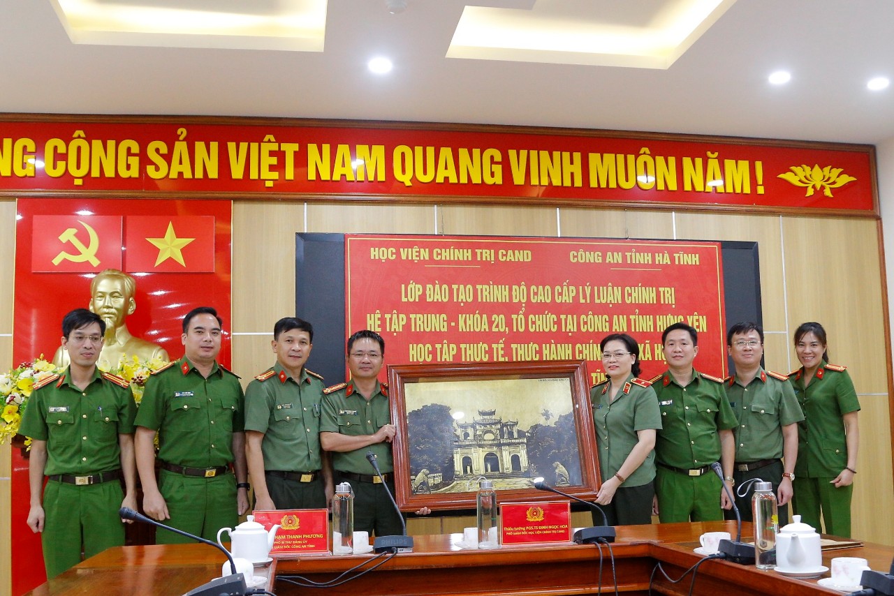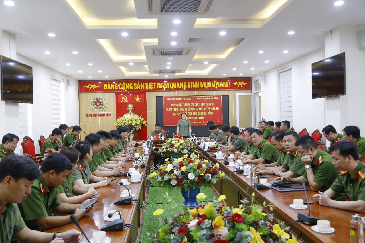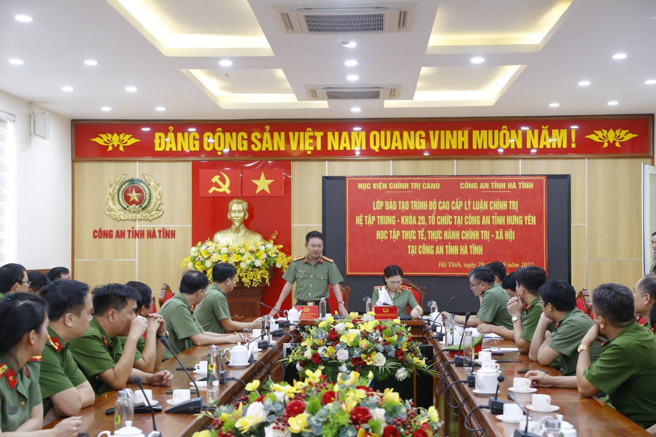 Thay mặt Đảng ủy, Ban Giám đốc Công an tỉnh Hà Tĩnh, đồng chí Đại tá Phạm Thanh Phương, Phó Bí thư Đảng ủy, Phó Giám đốc Công an đã trao đổi các vấn đề về đảm bảo an ninh, trật tự, xây dựng lực lượng CAND tại Công an tỉnh Hà Tĩnh. Đồng thời, cùng với học viên lớp học trao đổi kinh nghiệm, giải đáp các vấn đề về công tác đảm bảo an ninh, trật tự, xây dựng lực lượng CAND ở đơn vị, địa phương.