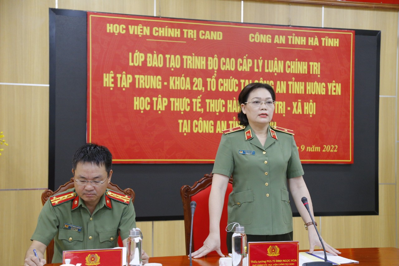 Phát biểu tại buổi làm việc, đồng chí Thiếu tướng, PGS. TS Đinh Ngọc Hoa, Phó Bí Thư Đảng ủy, Phó Giám đốc Học viện đã quán triệt mục đích, yêu cầu và định hướng những nội dung tổ chức học tập thực tế, thực hành chính trị - xã hội. Đồng chí nhấn mạnh: việc tổ chức học tập thực tế, thực hành chính trị - xã hội cho học viên các lớp đào tạo, bồi dưỡng lý luận chính trị nhằm gắn lý luận với thực tiễn là cơ hội để học viên lớp học liên hệ những kiến thức đã được học với thực tế công tác, góp phần nâng cao chất lượng, hiệu quả học tập của học viên nói riêng và chất lượng đào tạo của Học viện Chính trị CAND nói chung. Đây là một nội dung quan trọng trong chương trình học tập, luôn được Học viện quan tâm, gắn với thực hiện chủ trương đổi mới phương pháp đào tạo, bồi dưỡng cho đội ngũ lãnh đạo, chỉ huy đáp ứng yêu cầu đổi mới căn bản, toàn diện giáo dục, đào tạo trong CAND. Do đó, đề nghị học viên lớp học cần nghiêm túc, chấp hành đúng điều lệnh, nội quy học tập, tích cực trao đổi, đóng góp ý kiến để nâng cao chất lượng buổi học tập, trao đổi kinh nghiệm thực tế.