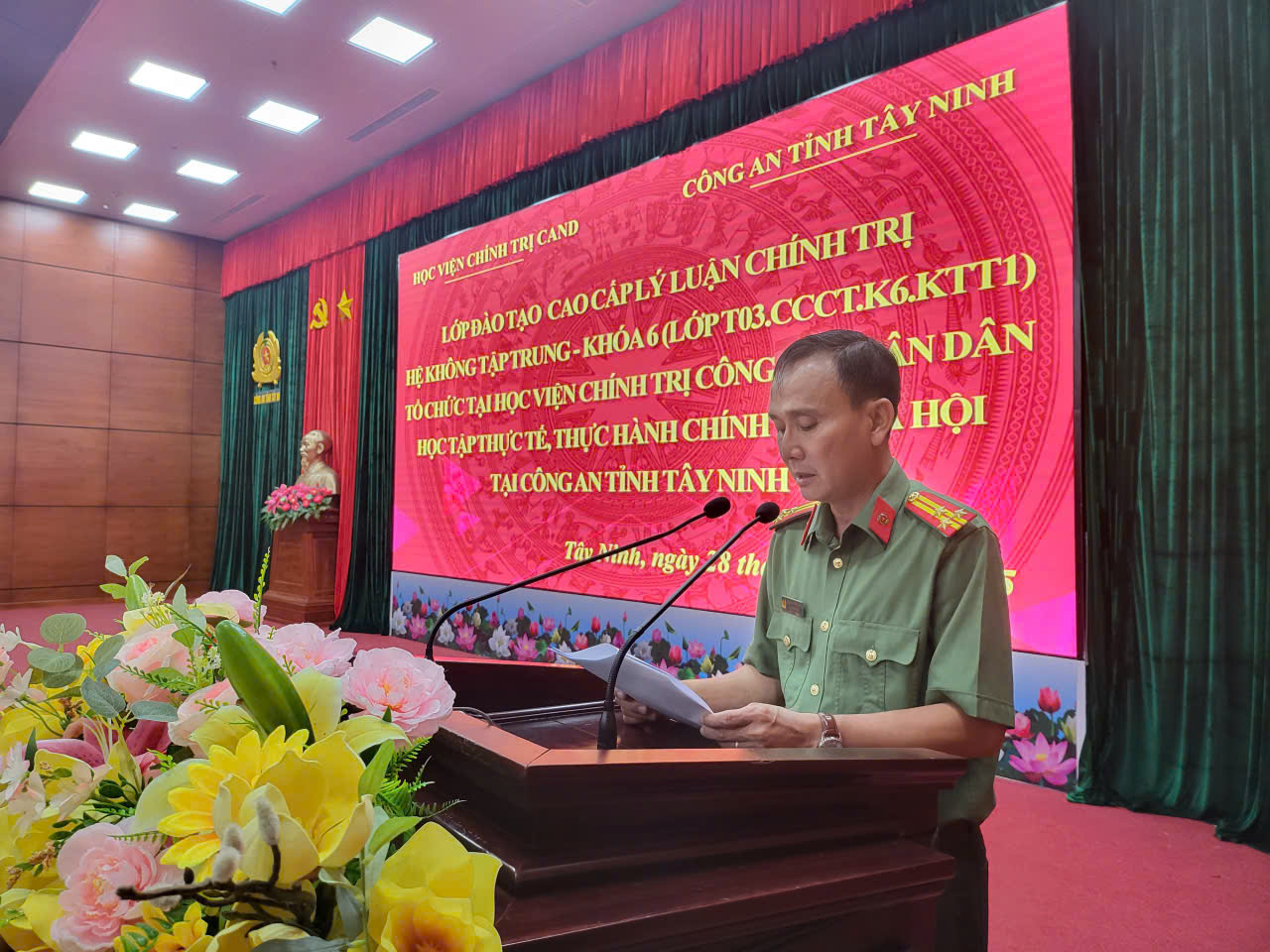 Thực hiện Kế hoạch số 2203/KH-T03-P3, ngày 10/10/2025 của Học viện Chính trị Công an nhân dân về việc tổ chức đi học tập thực tế, thực hành chính trị - xã hội cho lớp đào tạo trình độ cao cấp lý luận chính trị, hệ không tập trung - Khóa 6 (lớp T03.CCCT.K6.KTT1), từ ngày 27 đến ngày 31/10/2025, Học viện Chính trị CAND đã tổ chức Đoàn công tác đến Công an tỉnh Tây Ninh để học tập, trao đổi kinh nghiệm về công tác chính trị, tư tưởng, tổ chức cán bộ và xây dựng lực lượng CAND. Đoàn công tác do đồng chí Đại tá, TS Nguyễn Văn Tuấn, Phó Giám đốc Học viện Chính trị CAND làm Trưởng đoàn; tham gia Đoàn có đại diện lãnh đạo Phòng Quản lý đào tạo và bồi dưỡng nâng cao cùng tập thể học viên lớp T03.CCCT.K6.KTT1.
